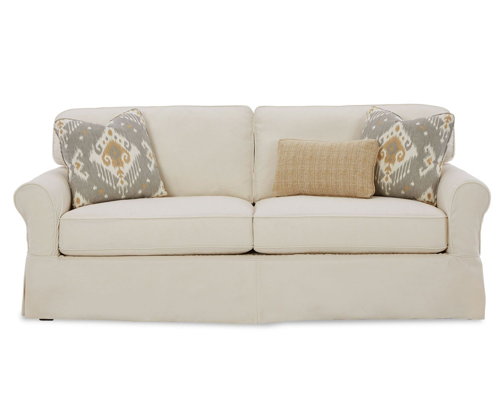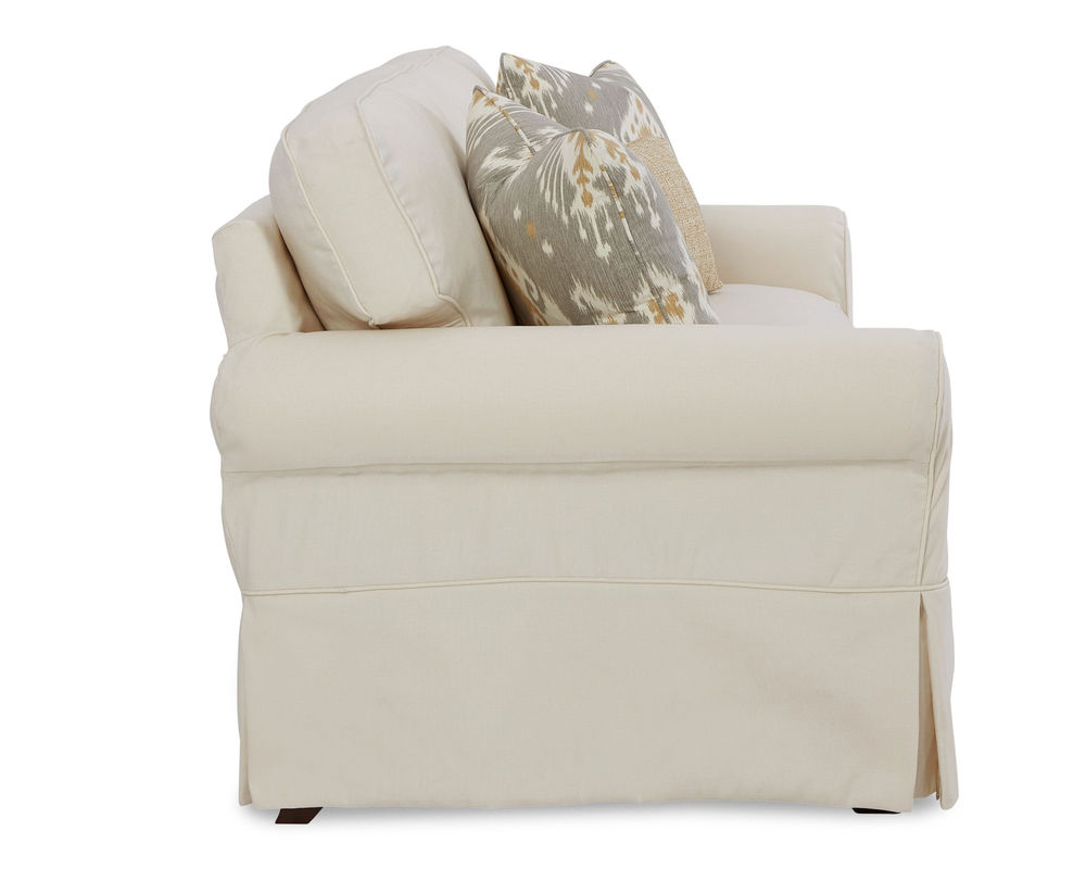 This timeless James 9174 Queen Sleeper sofa offers the perfect blend of traditional and modern design elements. The removable slipcover fits snugly, with Velcro attachments in key areas for easy convenience, and is offered in a variety of fabrics, including some that are machine washable. The box border backs and plush Blend Down seat cushions provide superior comfort, while two Blend Down toss pillows and one kidney pillow add a warm touch of style. Additional features include sock arms and a relaxed waterfall skirt for a casual yet versatile look. This sofa is available with a standard innerspring mattress or memory foam mattress and can be paired with a matching sofa, loveseat, chair, and ottoman, or as a sectional. Enjoy the inviting and fresh look of the James Queen Sleeper in your home.