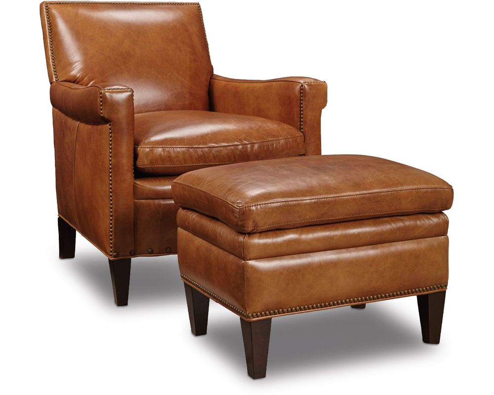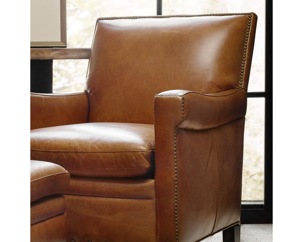 Sink into effortless elegance with the Jilian Club Chair from Hooker Furniture. Wrapped in luxurious Huntington Collis aniline top-grain leather, this chair offers classic club styling elevated by premium materials and handcrafted details. A generously plush seat and supportive high back invite hours of relaxed lounging, while the hand-applied brass nailhead trim and tapered wood legs in a rich Natchez finish complete the sophisticated look. Ideal for study, living room, or refined lounge settings.