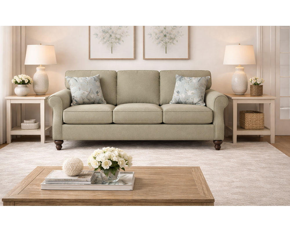 Classic design elements such as scooped rolled arms, a clean front rail, and turned wooden legs give the Jones sofa a refined yet inviting look that blends beautifully with both traditional and transitional décor. Plush seating and supportive cushions make it an easy place to relax, whether you're entertaining guests or enjoying a quiet evening at home.