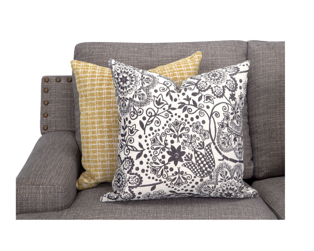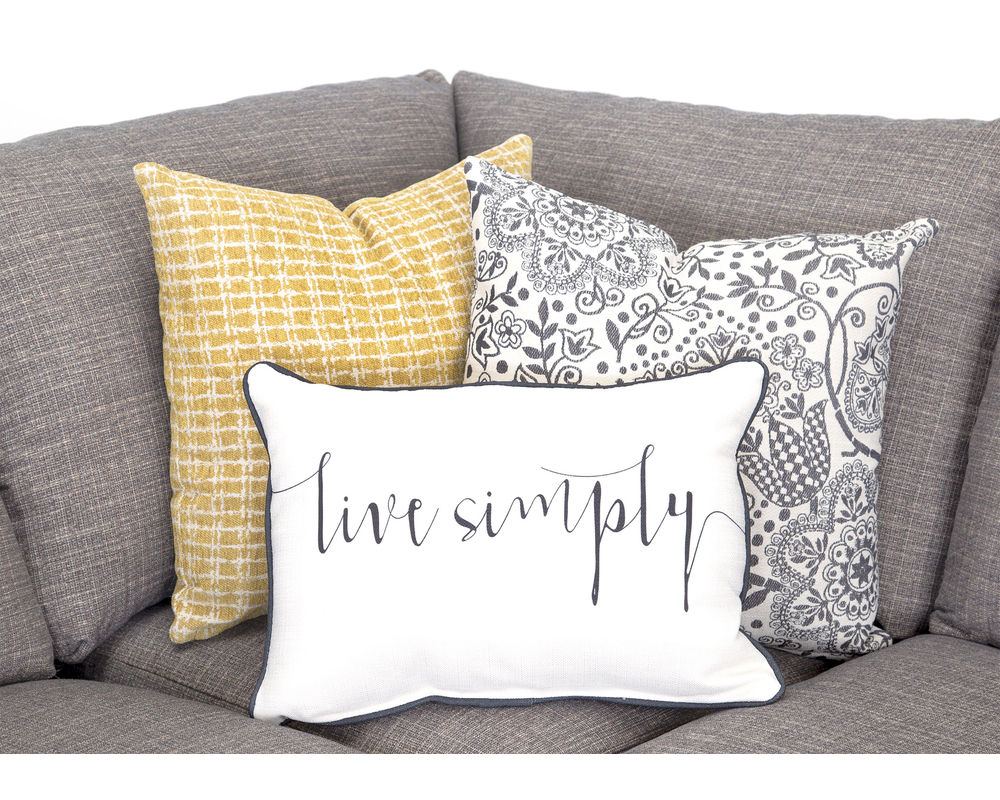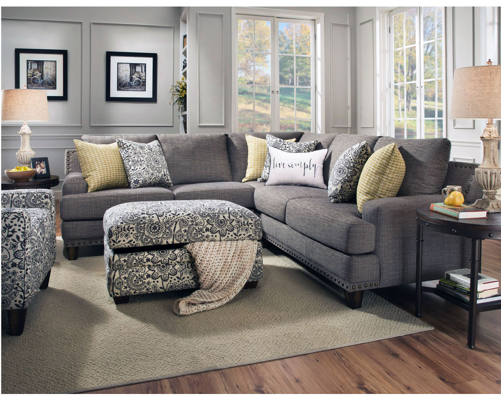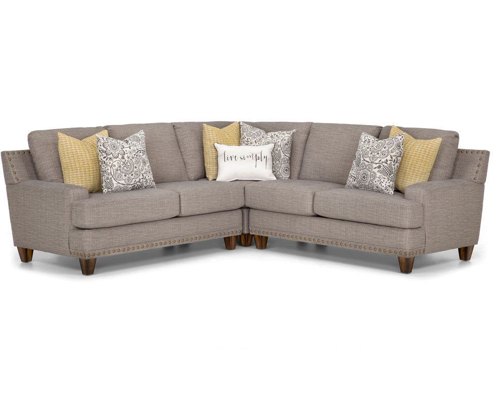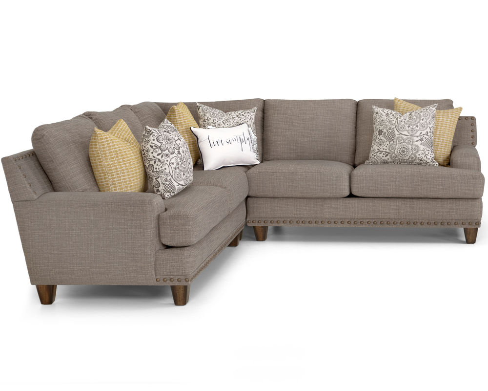 Tailored and crisp, Franklin's 864 Julienne Sectional is dressed in a flaxen sofa with a pop of maize color to brighten your day. Printed accent pillows with an airy design further texturize the sophisticated look. T-cushion seating and loose pillow seat backs are reversible for practicality and are framed by the sectional's track arms. Finishing details include a row of bold brass nail-head trim along the bottom seat rail bordering the back support and medium-stained tapered wood legs. Available options include armless chairs, which can be added to either side of the sectional for extra seating ability, as well as a coordinating ottoman. With its gel-injected seating foam and premium springs, Franklin delivers the best seating available today in their remarkable WOW seating system. Because Franklin fabricates its own foam, stamps its own reclining mechanisms, and cuts its wooden frames, it can stand behind its American-made product with the best warranty in the industry. Franklin demonstrates their obsession with quality and passion for their product with a lifetime warranty on the reclining mechanism, all other metal parts, and wooden frame parts.