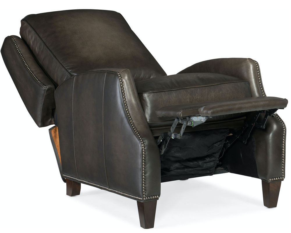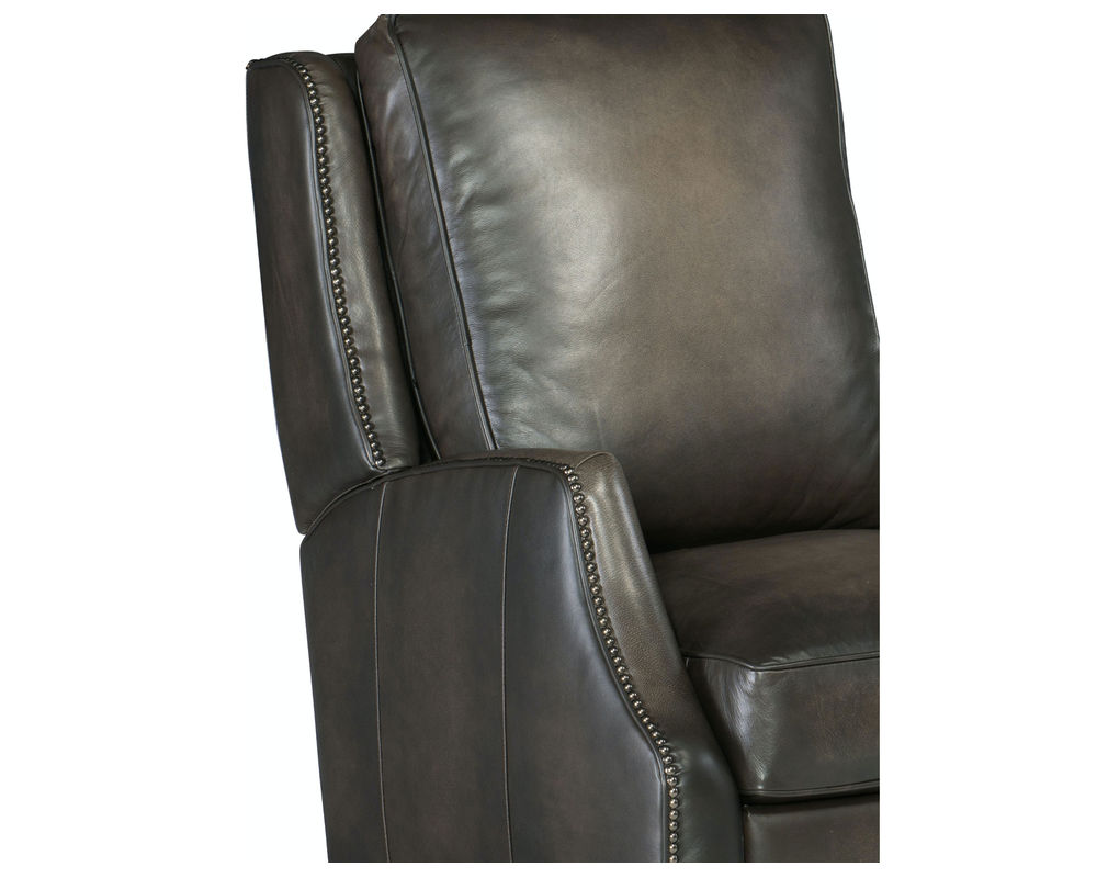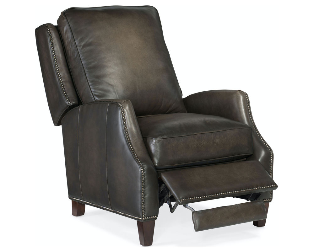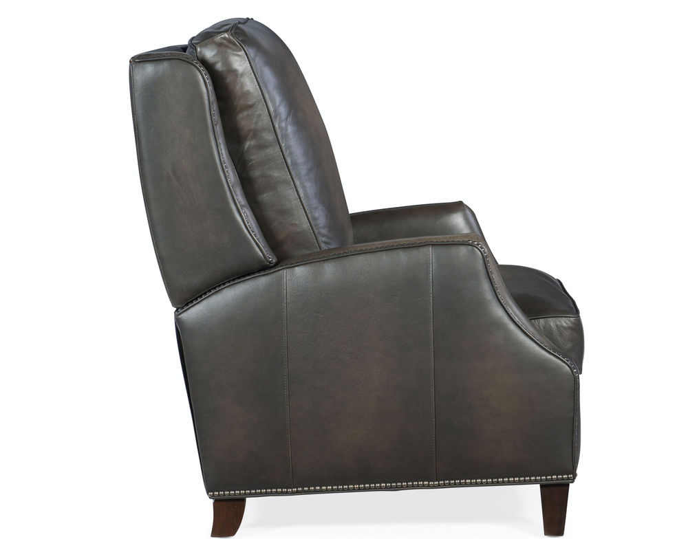 Refined and relaxed, the Kerley Push Back Leather Recliner from Hooker Furniture offers timeless style with modern comfort. Upholstered in Sarzana Castle hand-wiped top-grain leather, its sophisticated grey tone pairs beautifully with the Ludlow dark walnut wood finish. Subtle curves on the arms, a high back, and supportive cushioning provide the perfect mix of elegance and ease. With a push-back reclining mechanism and a full recline length of 66 inches, Kerley is ideal for those seeking understated luxury in a traditional silhouette.