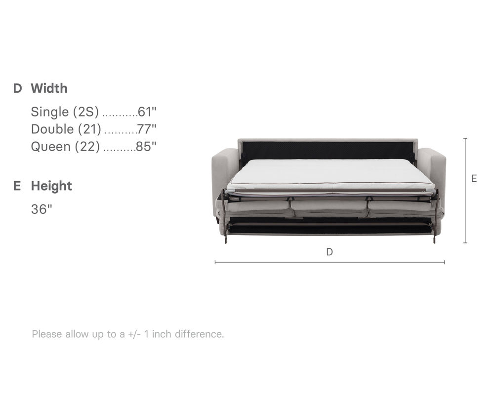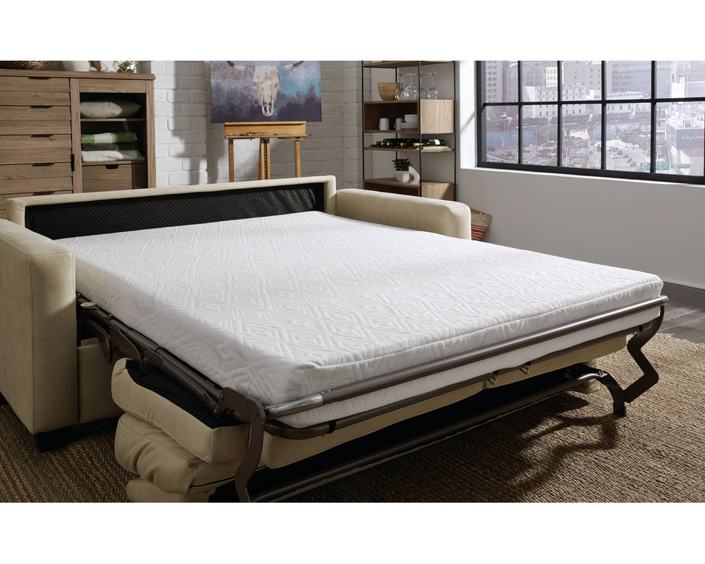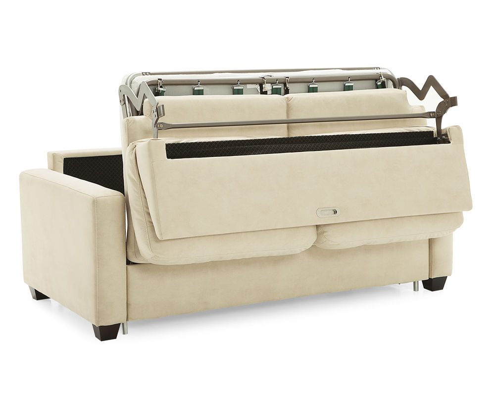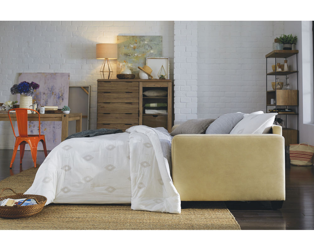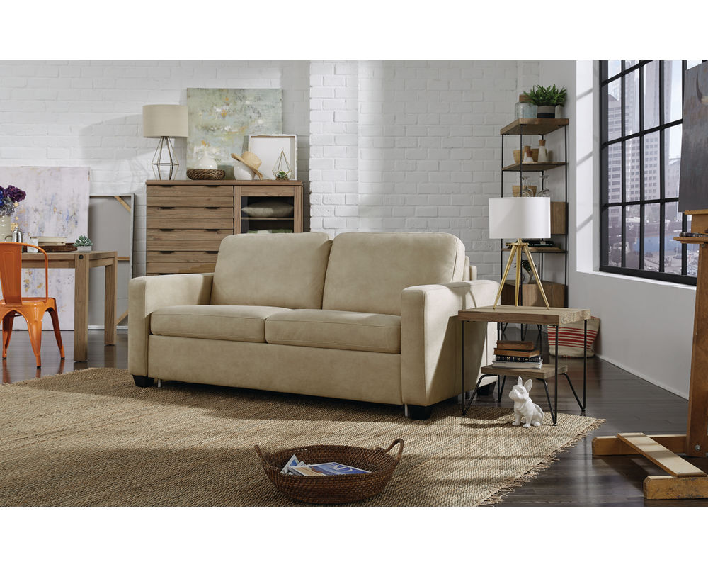 The attached seat and back cushions remain attached during opening and closing, eliminating the need to be stored when used for sleeping. Transition from sofa to bed seamlessly with the utilization of the steel European mechanism. Designed to be used in any living room or guest room, the Kildonan sofa bed is available in twin, full, or queen size.
