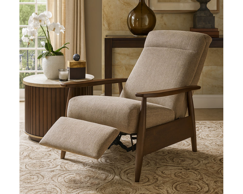 The Koenig High Leg Recliner pairs sleek, retro-inspired lines with the everyday comfort of a reclining chair. A solid wood frame in a warm finish highlights the sculpted arms and tapered legs, while the high back and plush cushions provide full-body support. With its tailored silhouette and hidden reclining mechanism, Koenig offers the look of a stylish accent chair with the comfort of a recliner—perfect for living rooms, reading nooks, or modern lounges.