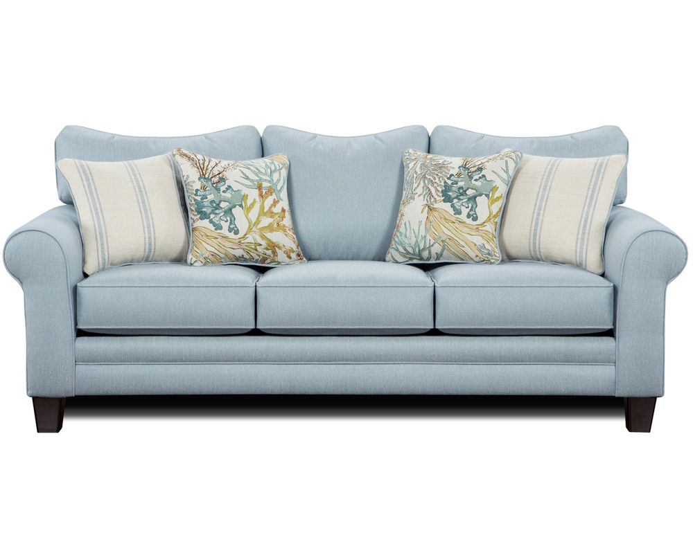 The Labyrinth Sky Sofa is a very casual to transitional styled sofa with two pairs of pillows and a coffee finish tapered leg. It also features rounded arms with loose reversible inside back cushions and loose, reversible box border welt seat cushions. The reversible cushions not only prolong the life of the fabric but also the life of the seat cores. With two sets of pillows, you can use all four together or mix and match to create different looks and feels. One of our most popular styles, Labyrinth Sky, will be the talk of your neighborhood. Due to lighting and monitor differences, actual colors and finishes may vary slightly from what appears online. In stock for immediate shipment.