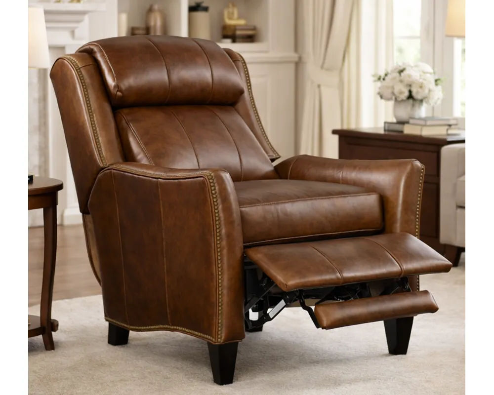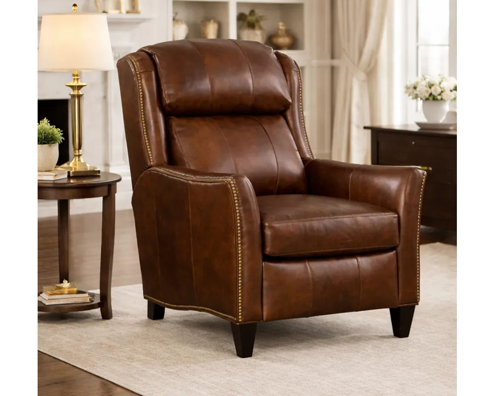 With itshigh-leg silhouette, tailored arms, and refined nailhead detailing, the Lancaster Recliner offers the look of a stationary accent chair with the added benefit of smooth reclining motion. Pushback recline comes standard, with an optional power recline upgrade available for effortless relaxation. Thoughtful customization options—including nailhead finishes, contrast welt, and premium upholstery choices—allow the Lancaster to be tailored perfectly to your space.