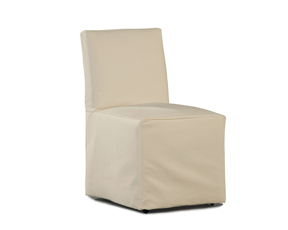 The Elena Slipcover Collection Dining Side Chair makes an excellent addition to your traditional outdoor dining space. Featuring a large seat and a tall back, the chair’s armless design makes it comfortable and accommodating for people of any size to enjoy it. The chair measures 34 inches in height by 20 inches in width by 24 inches in depth and can fit at most tables. It sits atop a durable wooden frame that is sturdy and stable, able to resist rotting and other damage that come from exposure to sun and rain.