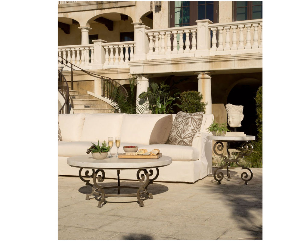Features • The frame is constructed of rust and mildew-resistant premium cast and wraught aluminum with a powder-coated finish. • Aluminum top is powder-coated in a faux travertine finish. • The pedestal base is powder-coated in a "Aged Gun Metal" finish. Available only as shown. • The finish is an "Aged Gun Metal". Available only as shown.