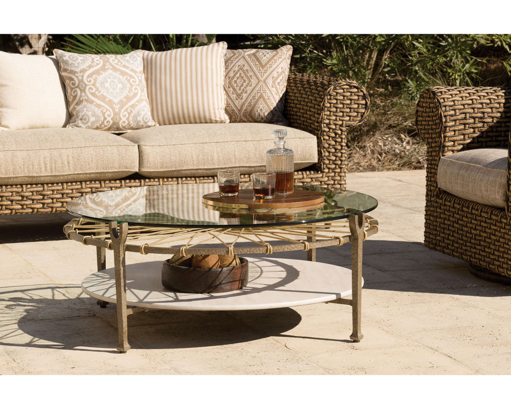 Features • The frame is constructed of rust and mildew resistant premium cast and wrought aluminum with a powder-coated finish. • Weather-resistant, high UV polyethylene synthetic fiber is hand-woven into a tribal "drum" design. • Suspended clear tempered glass over the woven décor. • Glass reinforced concrete bottom shelf. • The finish is a hammered "Gun Metal". Only available as shown.