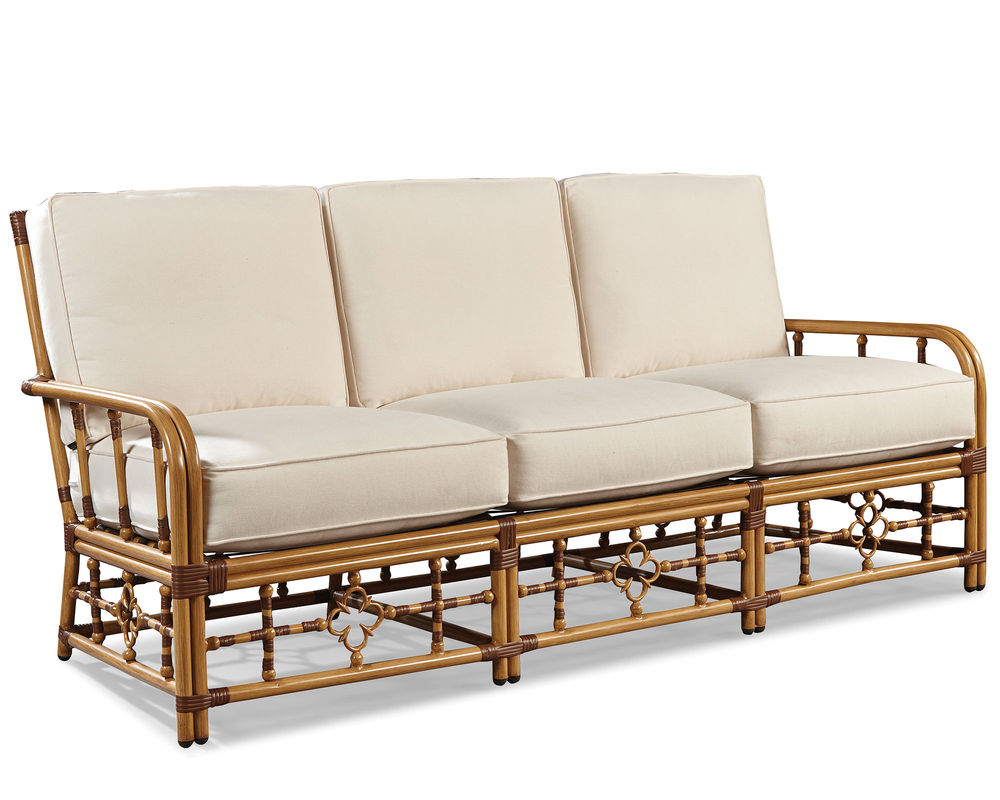 Mimi by Designer Celerie Kemble Sofa Inspired by vintage Palm Beach style, our Mimi sofa by Celerie Kemble is eloquent with details that are flirtatious, whimsical and feminine. Made from the highest quality of extruded aluminum, the powder coated frame is hand- finished to resemble natural rattan and can stand up to any type of weather. The iconic quatrefoil design of this style is a symbolic nod to the abundance of flowers that are part of everyday life in the south Florida paradise. Plush seating featuring the WeatherMaster ultimate outdoor cushion makes this classic sofa the favorite seat in any outdoor room.