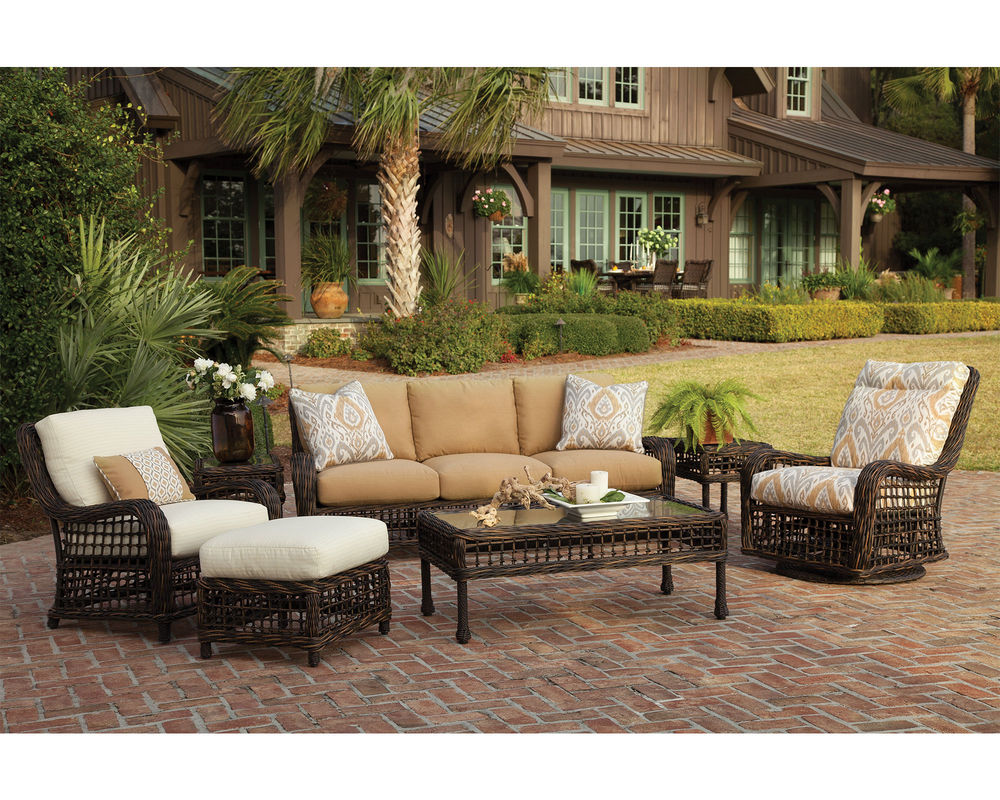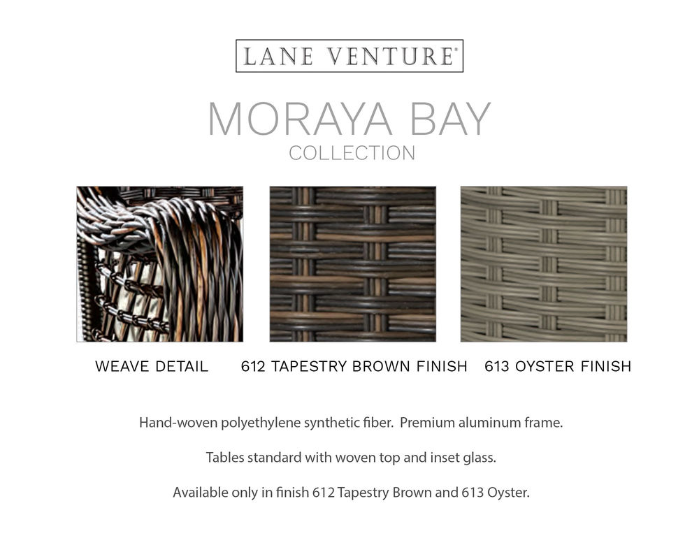 Features • The frame is constructed of rust and mildew resistant premium aluminum with a powder-coated finish. • Weather-resistant, high UV polyethylene synthetic fiber is hand-woven over premium aluminum frame for a natural woven look. • Removable cushions feature the exclusive LANE VENTURE Ultimate WeatherMaster drainable cushions for soft seating and durability of a drainable all-weather fiber cushion plus, the comfort and longevity of spring coil seating. Box weltless cushions with • Cushions are available in all LANE VENTURE stain and mildew-resistant solution dyed fabrics. • Available in your choice of Tapestry Brown or Oyster finish.