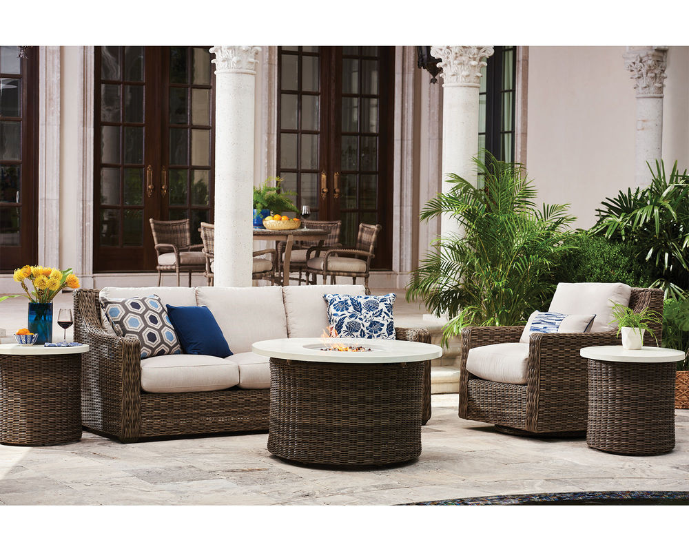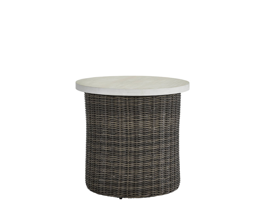 Features • The frame is constructed of rust and mildew resistant premium aluminum with a powder-coated finish. • Weather-resistant, high UV polyethylene synthetic fiber is hand-woven over premium aluminum frame for a natural woven look. • Table top is premium powder-coated aluminum in a faux travertine finish. • Available only Ash finish as shown.