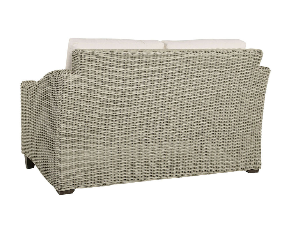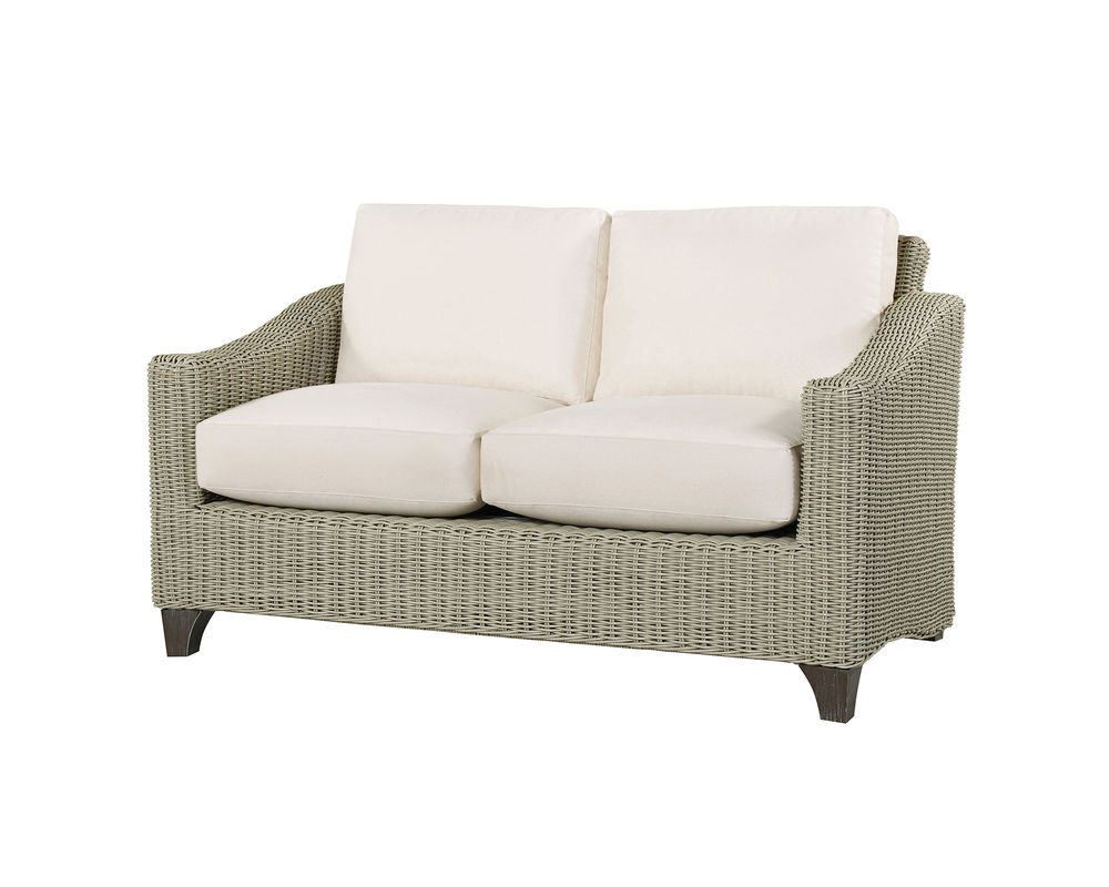 Outdoor rooms with limited space don't have to sacrifice style. Our Requisite loveseat is the perfect solution with its gently sloped arm and off the ground design, you can transform any area into a relaxing haven. With its sturdy double-wall construction in an elegant basketweave pattern, this silhouette will work with many home styles. You'll love the luxurious deep seating comfort that is provided by the WeatherMaster Ultimate outdoor cushion. Woven from premium synthetic fiber over a powder-coated aluminum frame, there are two finishes from which to choose: Macchiato is a dark, rich brown with warm caramel highlights, while Bone is a lighter finish that is soft white with gray undertones.