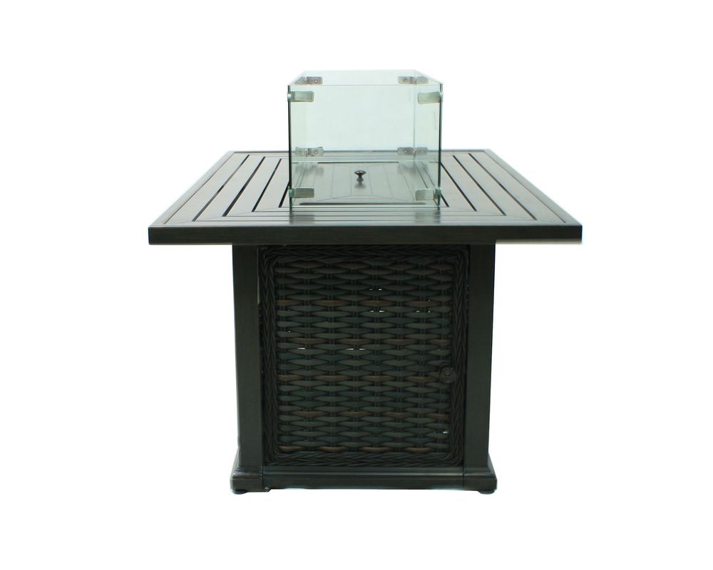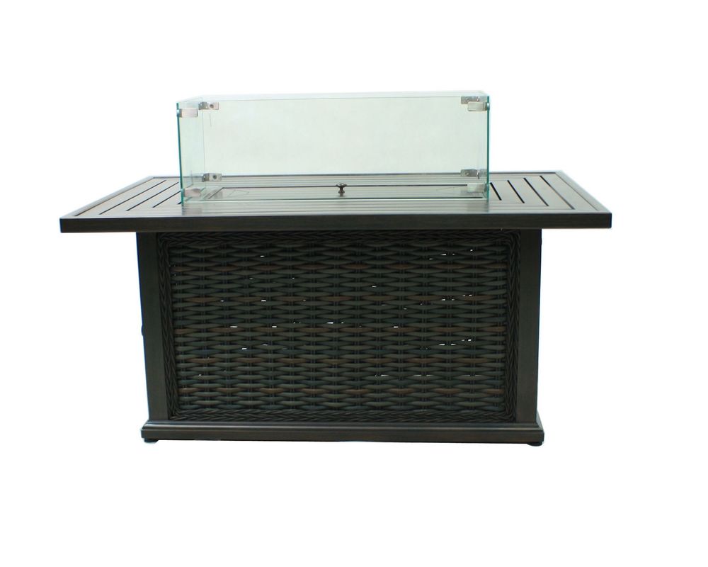 With its glass top that houses within it the flickering flames of the fire, the South Hampton Rectangular Gas Fire Pit is perfect for those who want to add class to their outdoor living space while enjoying all of the visual appeal that comes with a glowing fire. This fire pit measures 24 inches in height by 50 inches in width by 32 inches in depth and can fit into most any patio area. It has a durable powder-coated aluminum frame that is concealed behind the wicker material. This wicker is synthetic, but it has been given a finish that makes it appear all natural and genuine.
