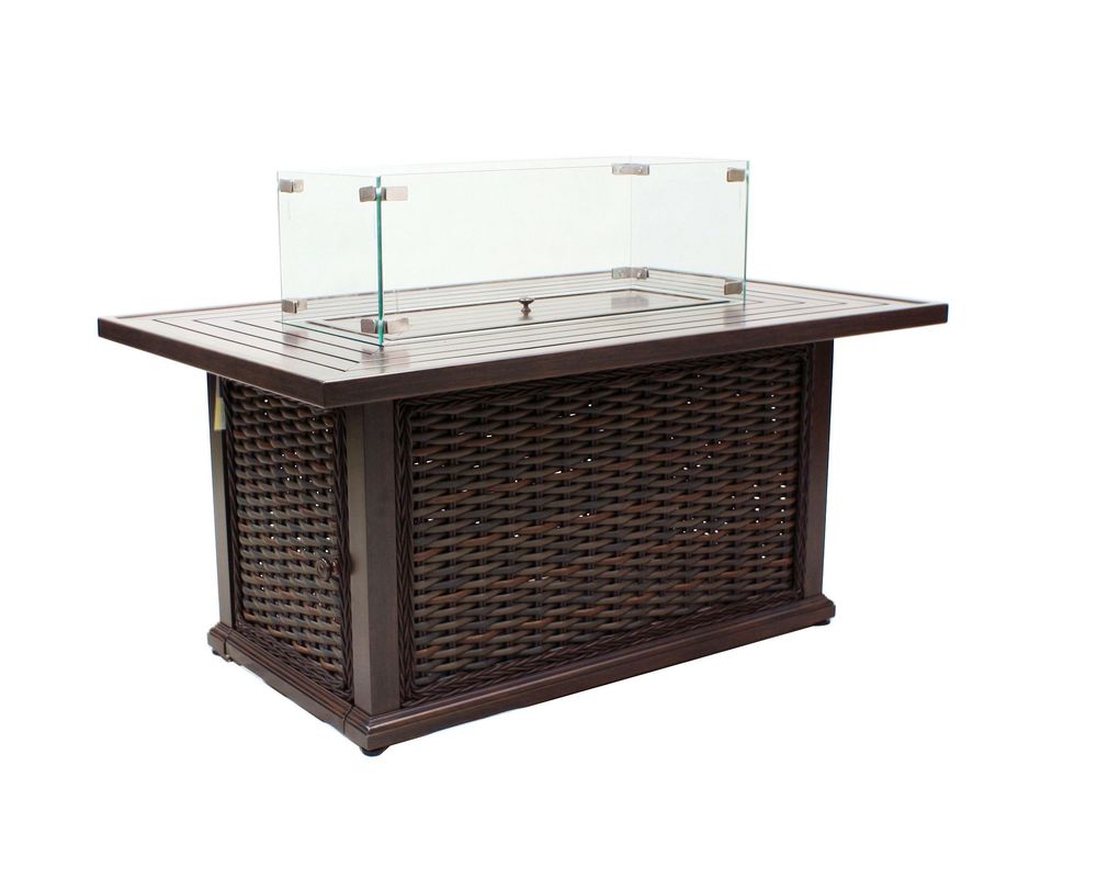 Features • Weather-resistant powder-coated premium frame with high UV polyethylene hand-woven to look like natural wicker over the base. Aluminum top. • Features a slide out drawer for propane gas storage. Propane gas fueled. Will produce 60,000 BTU. Natural Gas conversion kit available. • Includes burner cover for a seamless top when fire pit is not in use. Decorative heat-resistant glass rocks are included in choice of Crystal, Amber or Mixed Crystal & Amber • Available in choice of warm Tuscan Brown Finish or lighter Sandalwood Finish • Available accessories include Glass Windscreen and Natural Gas Conversion Kit.