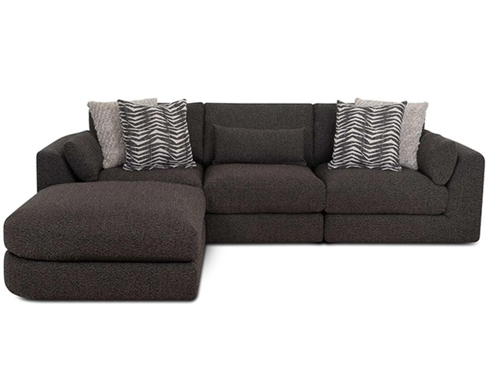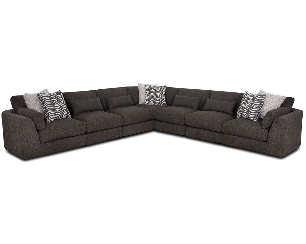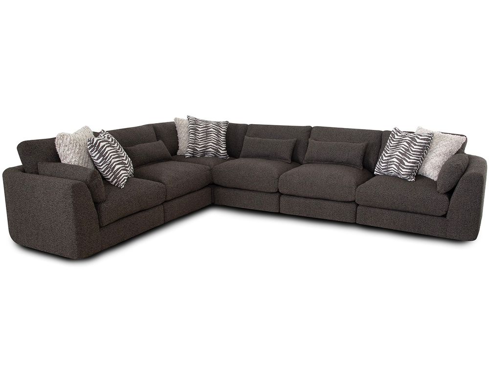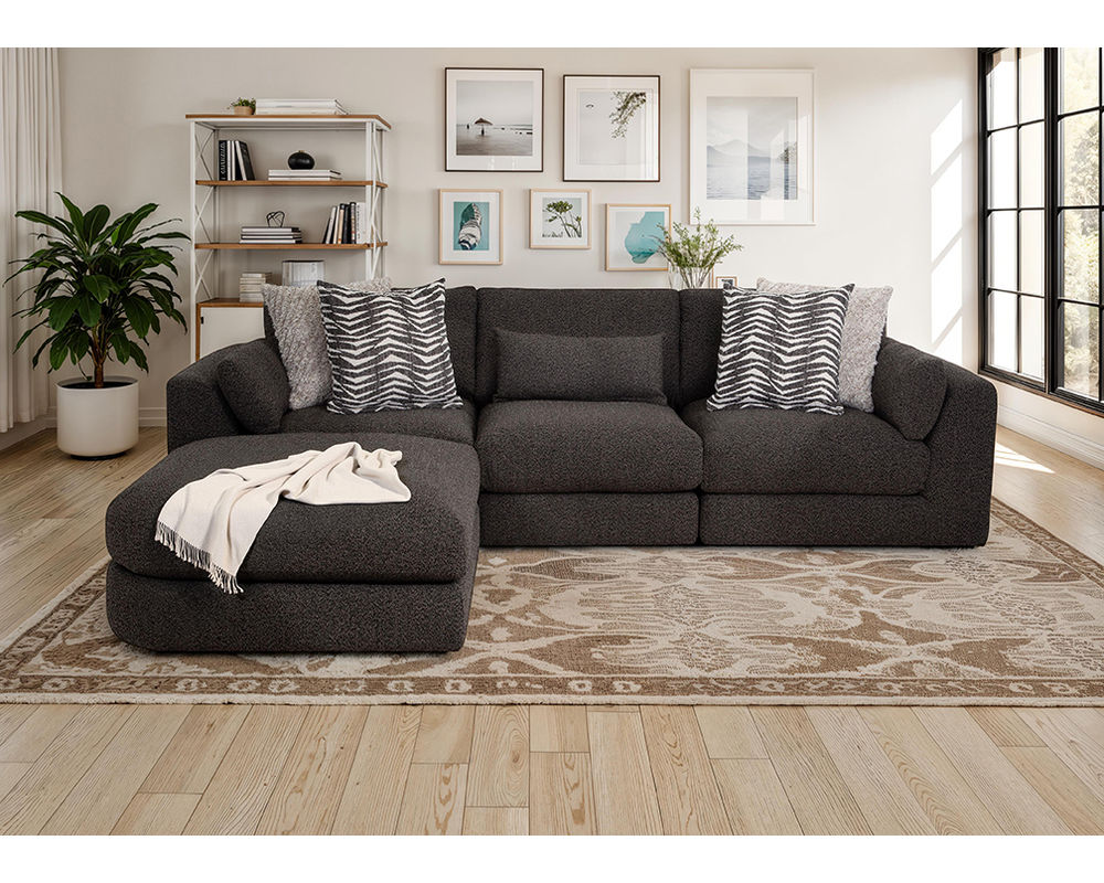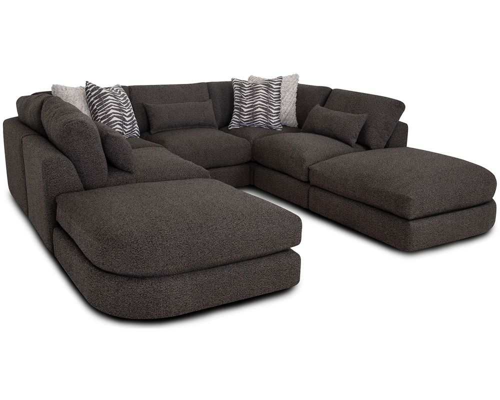 The Laney 938 Modular Sectional from Franklin Furniture combines luxurious comfort with unmatched versatility to elevate your living space. Upholstered in a rich, dark textured fabric, the Laney adds depth and sophistication while maintaining a warm, inviting feel. Its plush modular design allows you to create the ideal configuration for lounging, entertaining, or stretching out in total comfort. Coordinating accent pillows — featuring a mix of abstract stripe patterns and soft, boucle-inspired textures — add dimension and a modern, designer touch.