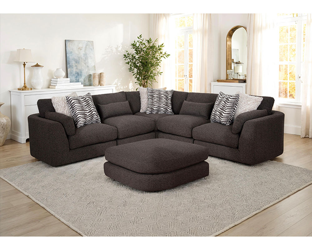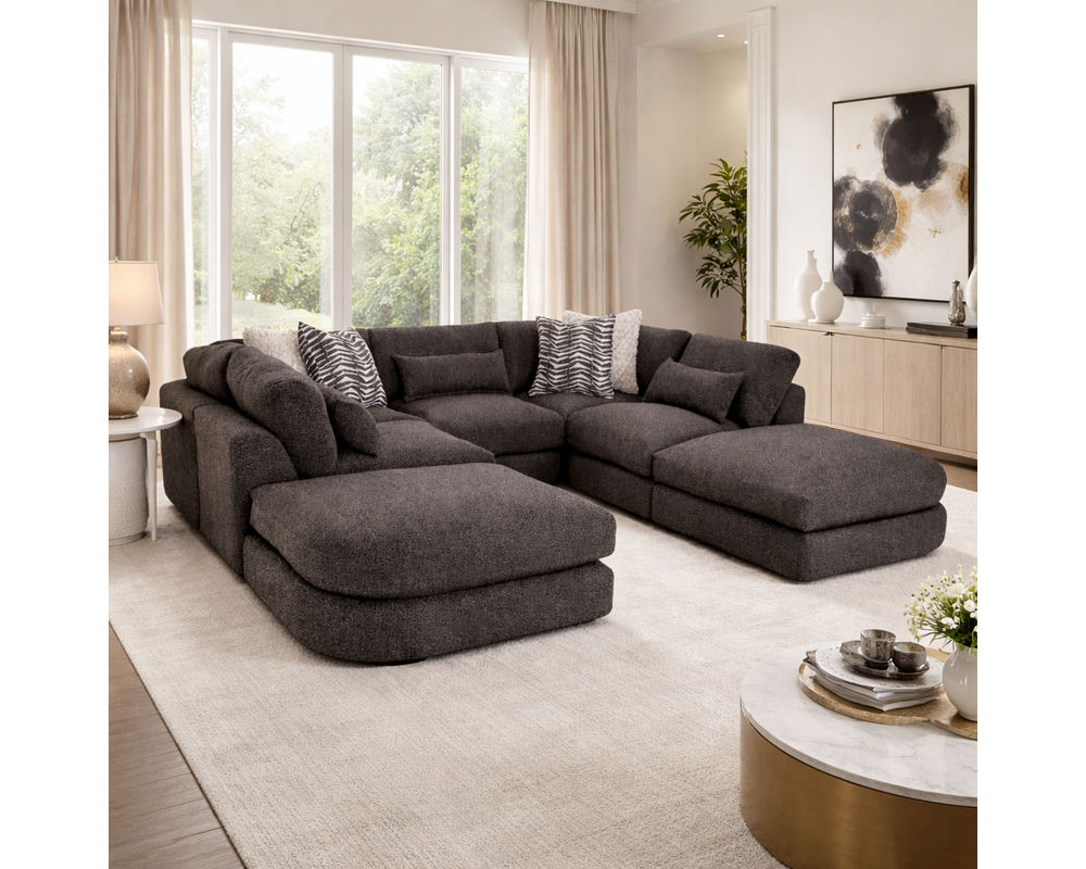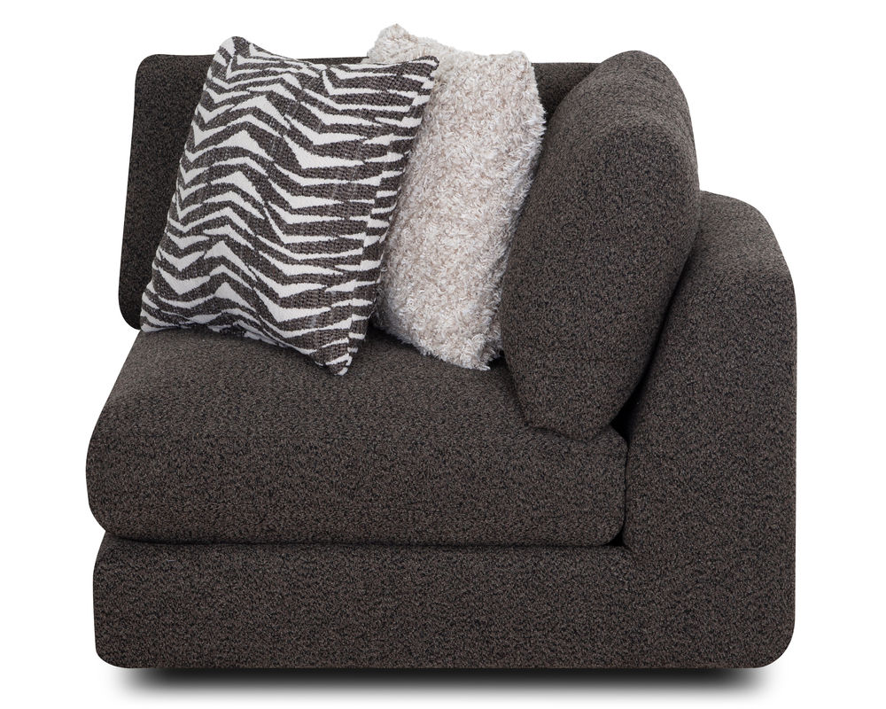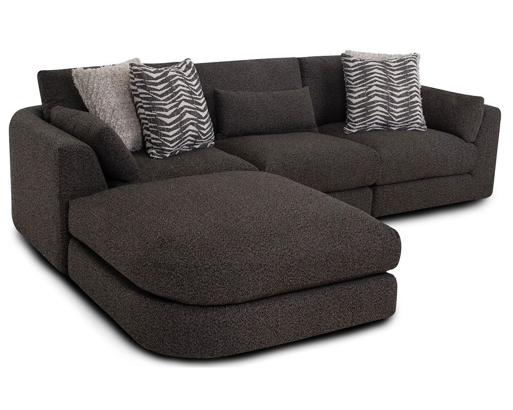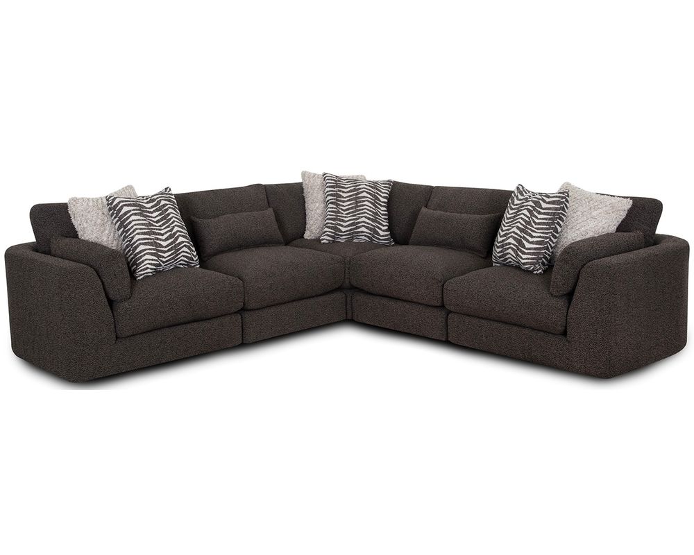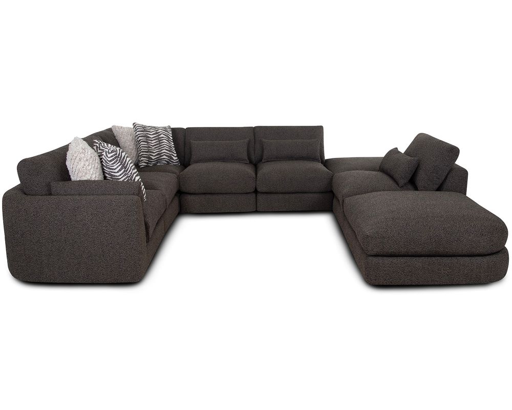 The Laney 938 Modular Sectional from Franklin Furniture combines luxurious comfort with unmatched versatility to elevate your living space. Upholstered in a rich, dark textured fabric, the Laney adds depth and sophistication while maintaining a warm, inviting feel. Its plush modular design allows you to create the ideal configuration for lounging, entertaining, or stretching out in total comfort. Coordinating accent pillows — featuring a mix of abstract stripe patterns and soft, boucle-inspired textures — add dimension and a modern, designer touch.