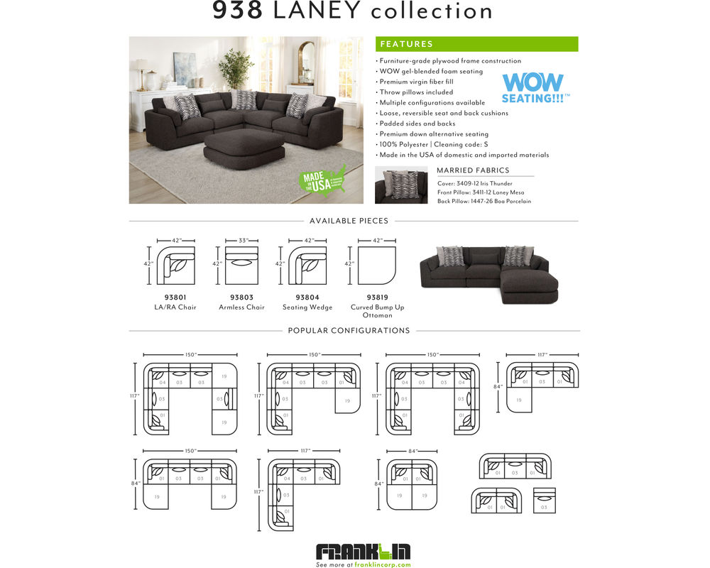 Built with Franklin’s exclusive WOW Seating System, the Laney features precision-cut, furniture-grade plywood frames paired with gel-blended foam seating for exceptional support and long-lasting comfort. Loose, reversible seat and back cushions are designed to flip, promoting even wear and extending the life of your sectional. With its bold presence, adaptable layout, and comfort-driven construction, the Laney 938 Modular Sectional redefines relaxed living with style and flexibility.