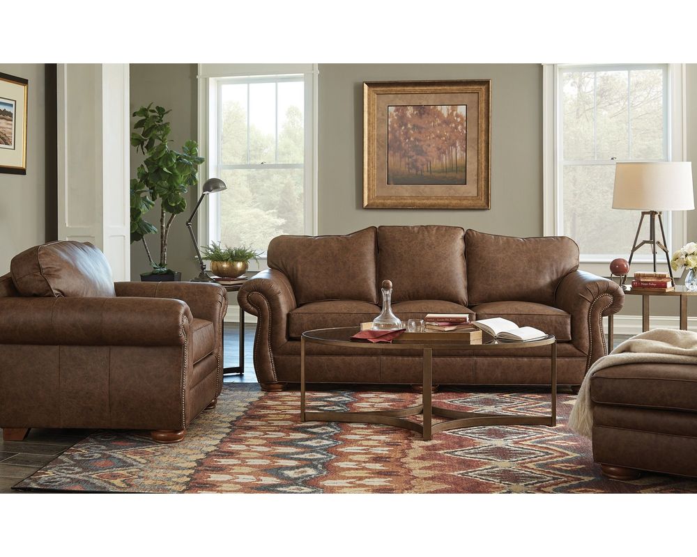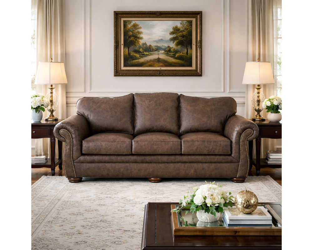 The Laredo L2685 Leather Sofa brings timeless style and inviting comfort to your living space. This three-seat design showcases Bombay-shaped arms accented with brass nailhead trim and a graceful camel-back silhouette, creating a refined statement that feels both elegant and welcoming. Rich premium top-grain leather upholstery enhances the look while adding durability and character.