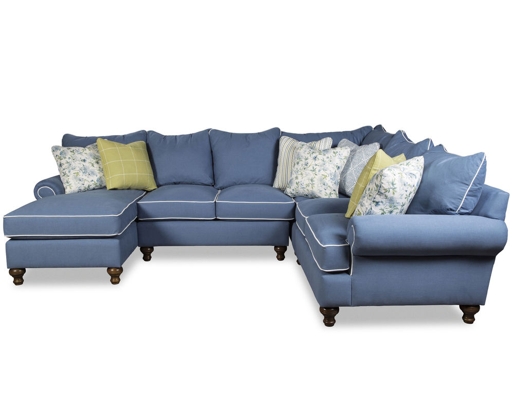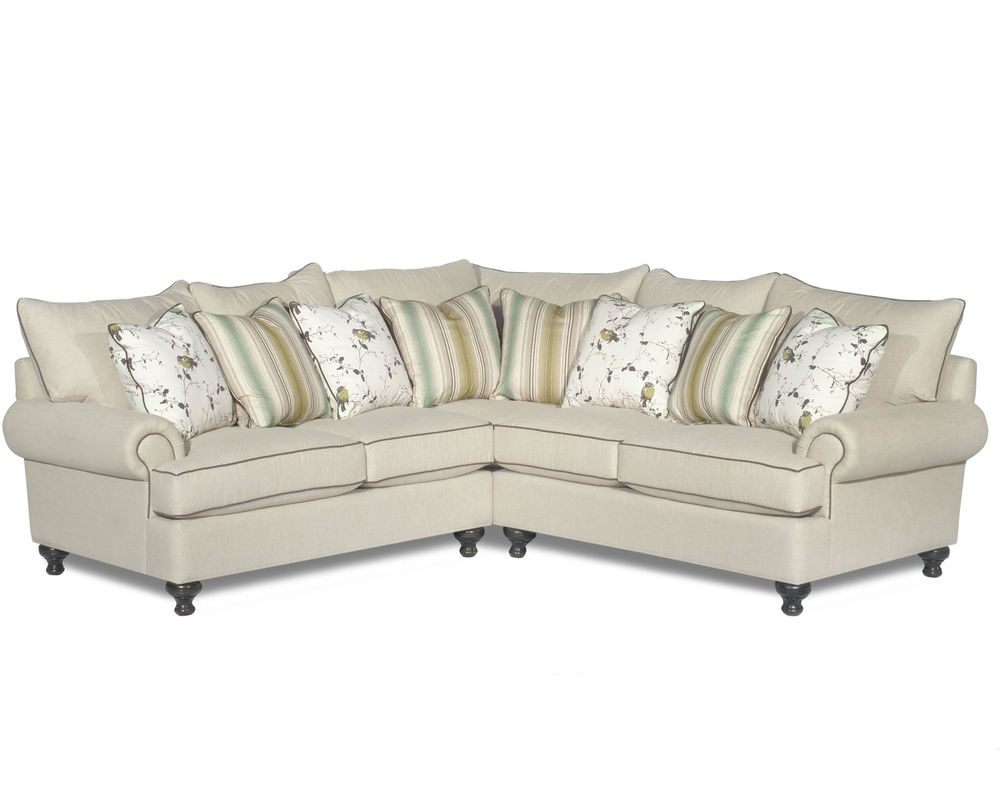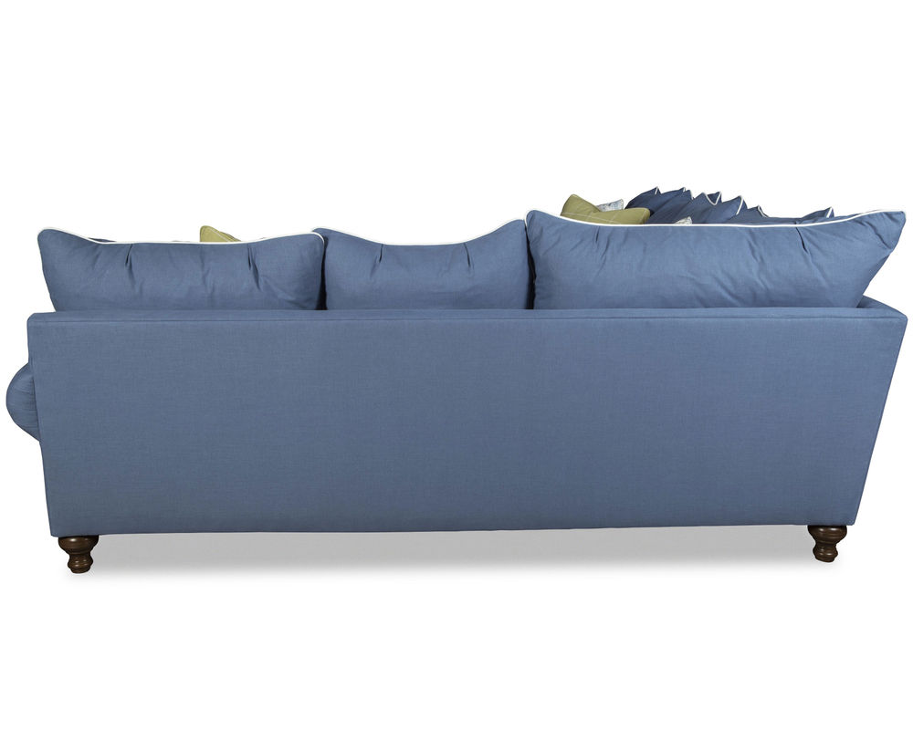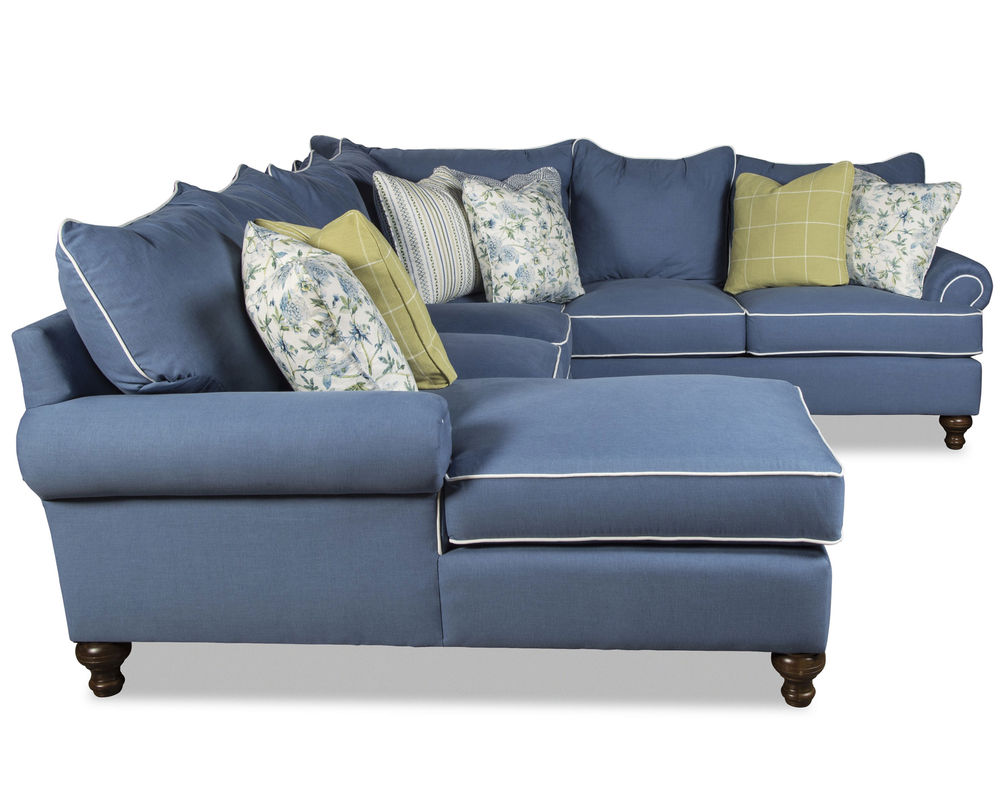 This casual sectional from the Paula Deen Home collection, is one of our favorites, and a best seller too. It's easy to see why! For starters, it's generous in scale and features an armload of pillows to curl up and relax on. The loose pillow backs, roll arms, and turned wood legs give it a laid back, casual look that Paula is so proud of! It also features her exclusive Down Blend cushions that wrap you in comfort from the first moment, but will last for years. This style has many pieces available, including chaise and cuddler, to create a size and shape to fit most any space. Also available are the matching sofa, loveseat, chair 1/2, ottoman. Over 100 high performance fabrics and 15 wood finishes.