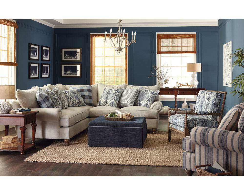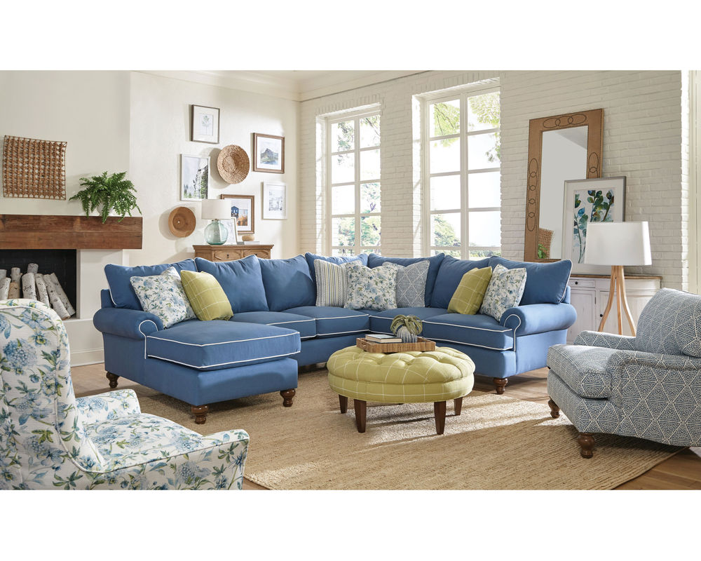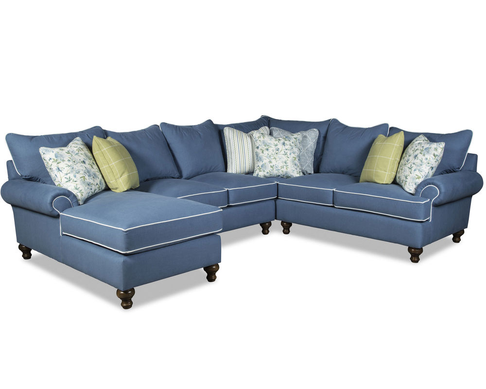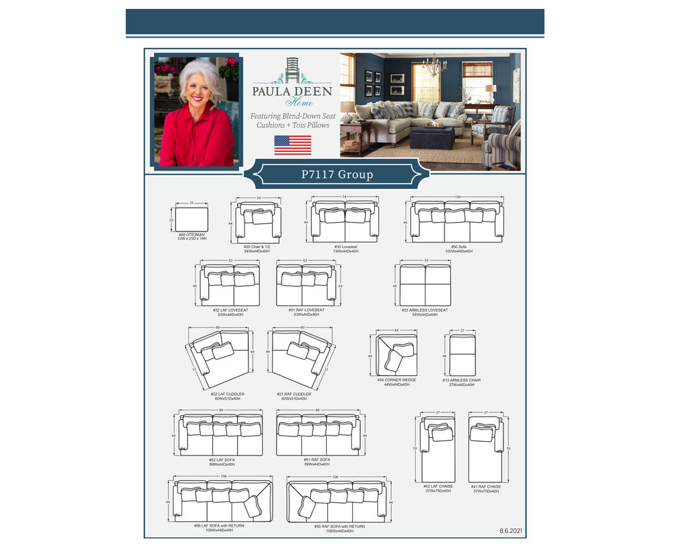 This casual sectional from the Paula Deen Home collection, is one of our favorites, and a best seller too. It's easy to see why! For starters, it's generous in scale and features an armload of pillows to curl up and relax on. The loose pillow backs, roll arms, and turned wood legs give it a laid back, casual look that Paula is so proud of! It also features her exclusive Down Blend cushions that wrap you in comfort from the first moment, but will last for years. This style has many pieces available, including chaise and cuddler, to create a size and shape to fit most any space. Also available are the matching sofa, loveseat, chair 1/2, ottoman. Over 100 high performance fabrics and 15 wood finishes.