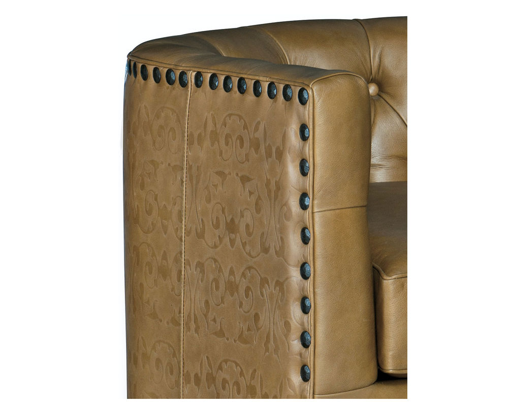 • Traditional/Formal styling • Button tufted backOld Gold nailhead trim • Contrasting novelty leather outside