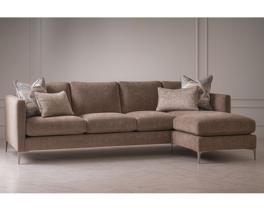 The Lenox Metal Leg Chaise Sectional is designed for those who want sophisticated style and flexible comfort in one versatile piece. With sleek track arms, clean lines, and your choice of gold or nickel-finished metal legs, this sectional brings a modern edge to any living space. The chaise can be positioned on the left or right side, allowing you to tailor the layout perfectly to your room.