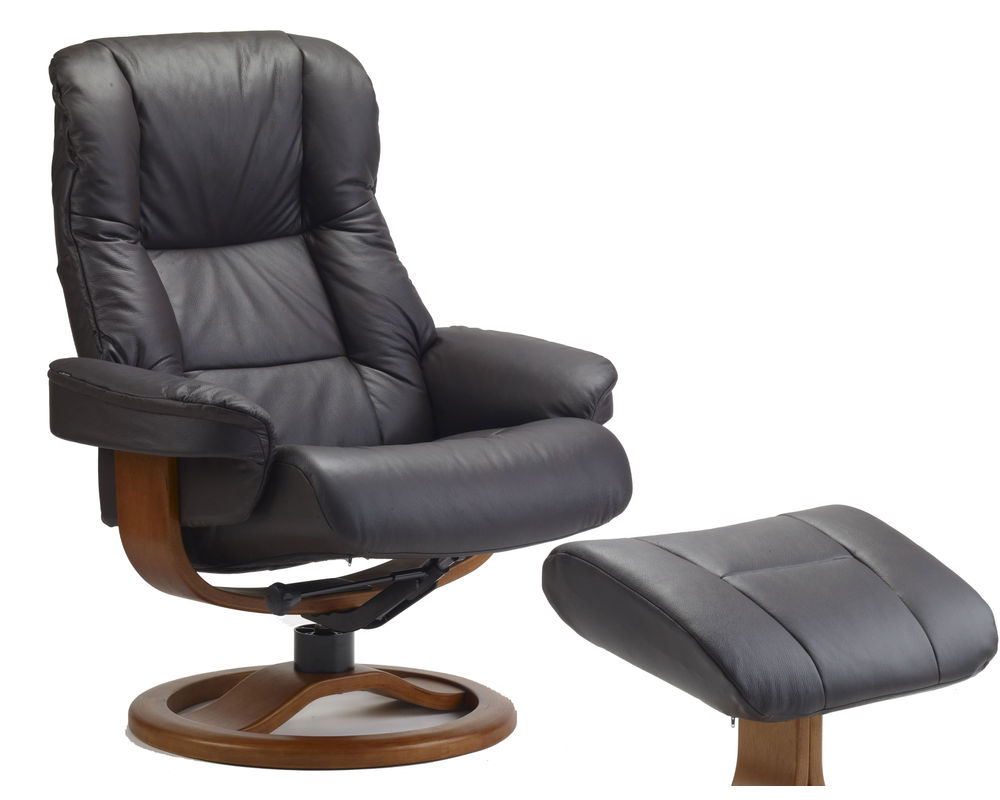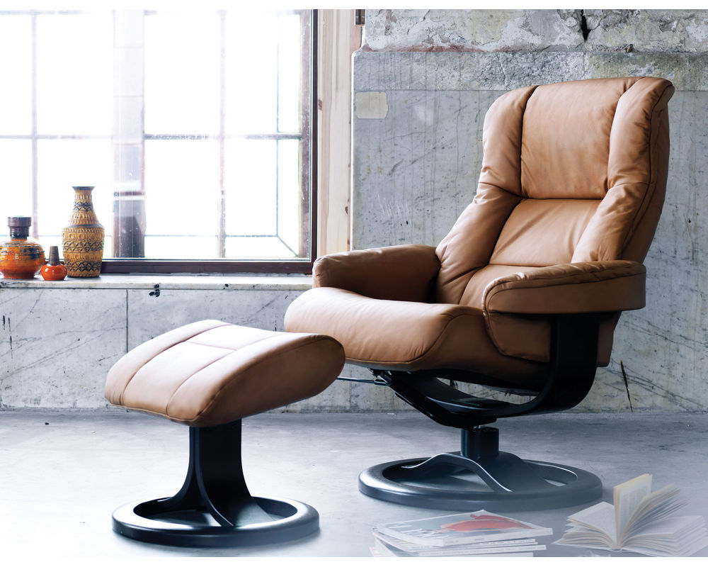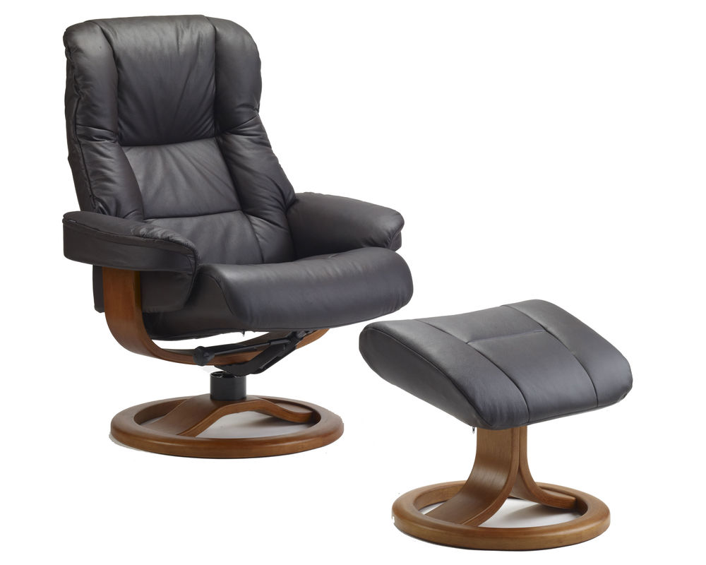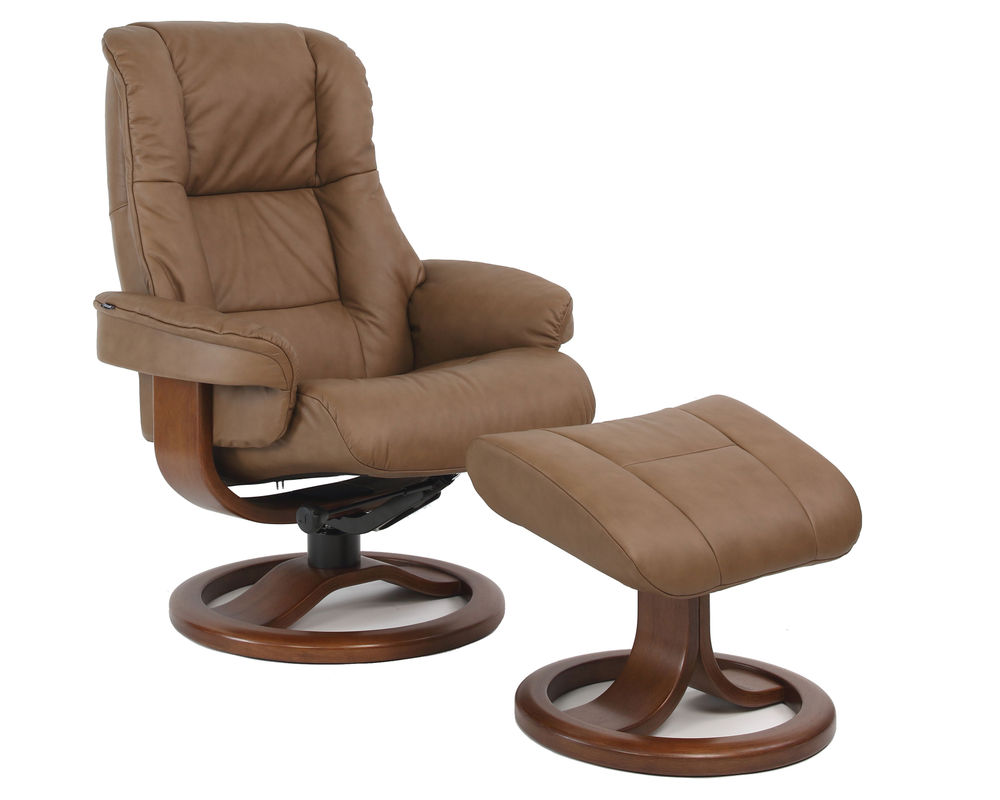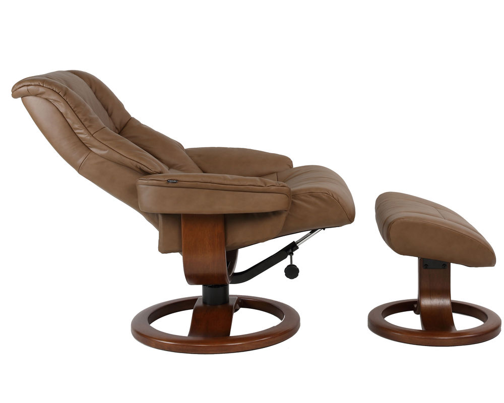 The Loen R Swivel Recliner and Ottoman is an ergonomic recliner from Fjords that is a stylish addition to any living room. Crafted with top grain leather, this recliner has a swivel base with 360 degrees of rotation and offers continuous reclining of the back to provide comprehensive support that prevents tiredness in your legs and back. Your individual resting position is easily achieved by moving your body. Whether you are watching TV, reading a book, or surfing the net, prepare for relaxation on a whole new level once the Admiral R recliner and ottoman is sitting in your living room. The chair is available in two sizes, small and large. Select from over 30 top grain leathers and 7 base wood colors.