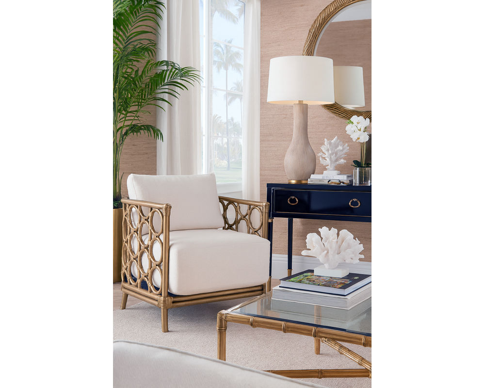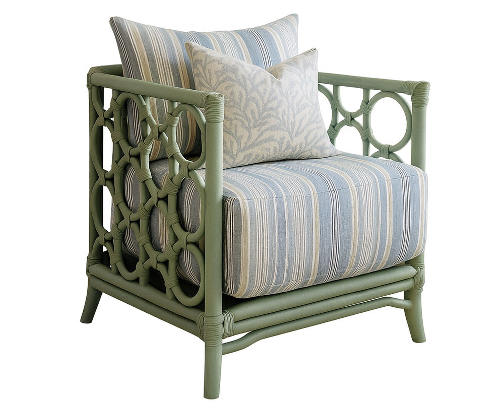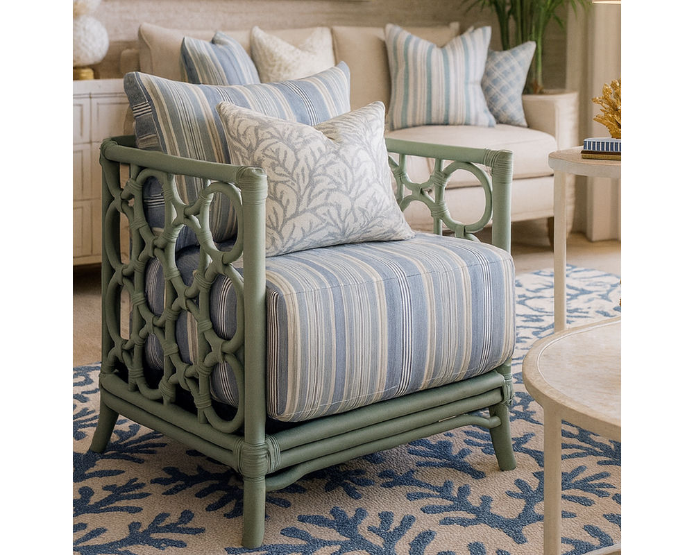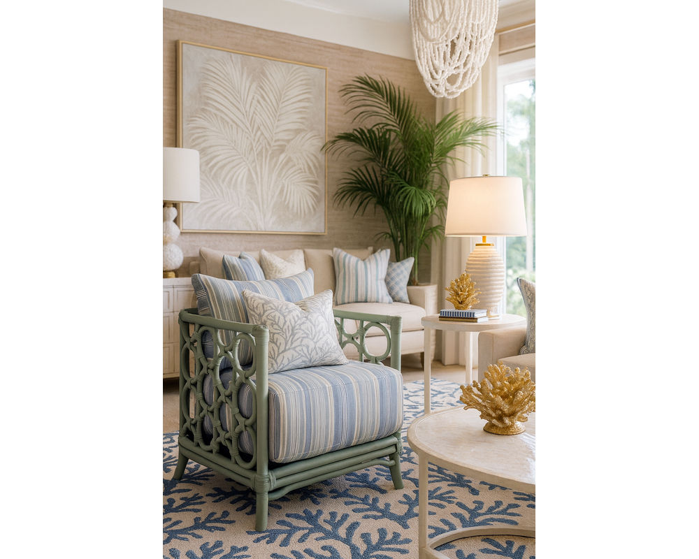 The Lyla Rattan Accent Chair blends natural rattan artistry with modern comfort. Featuring a bold rattan/wicker frame with intricate openwork design, this chair brings texture, charm, and a relaxed coastal feel to any living space. Its loose seat and back cushions are built with Comfort Plus high-performance cores for exceptional durability and support, while webbing seat construction enhances lasting comfort. Handcrafted in the USA and customizable in a wide range of fabrics and finishes, the Lyla Chair is a versatile accent piece that balances beauty and function.