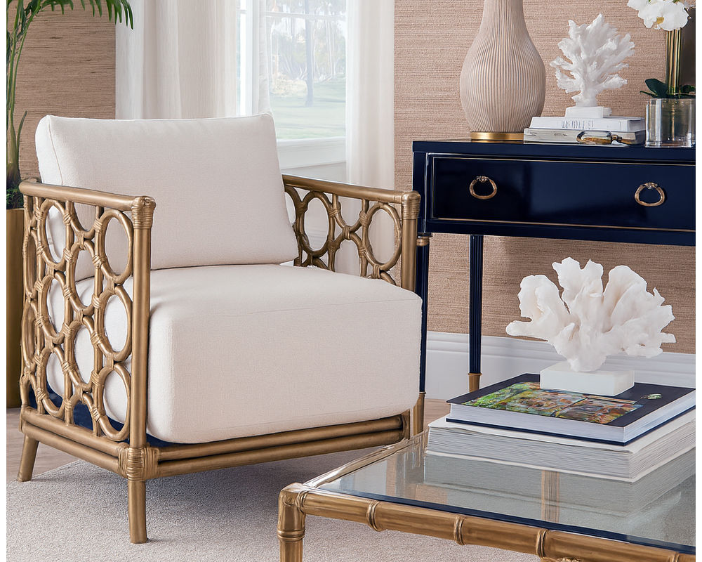 The Lyla Rattan Accent Chair blends natural rattan artistry with modern comfort. Featuring a bold rattan/wicker frame with intricate openwork design, this chair brings texture, charm, and a relaxed coastal feel to any living space. Its loose seat and back cushions are built with Comfort Plus high-performance cores for exceptional durability and support, while webbing seat construction enhances lasting comfort. Handcrafted in the USA and customizable in a wide range of fabrics and finishes, the Lyla Chair is a versatile accent piece that balances beauty and function.