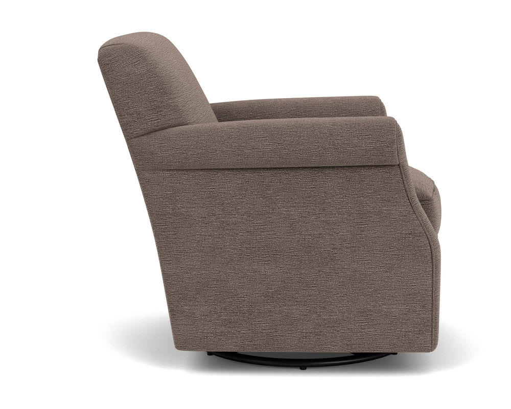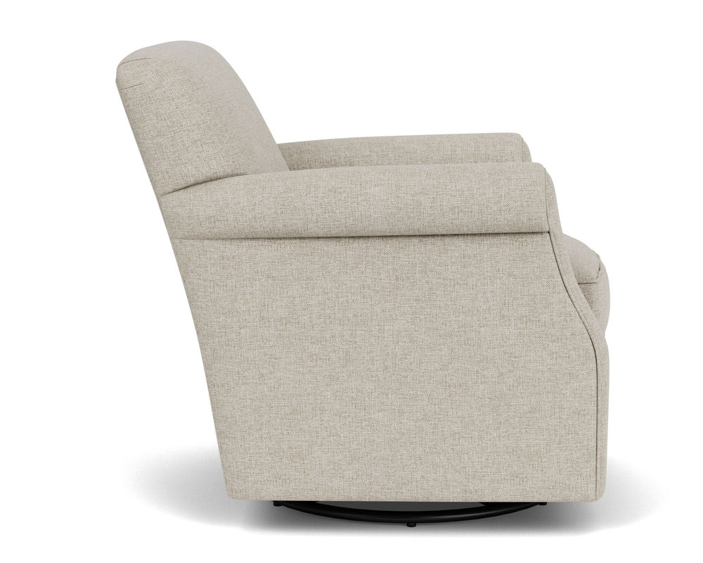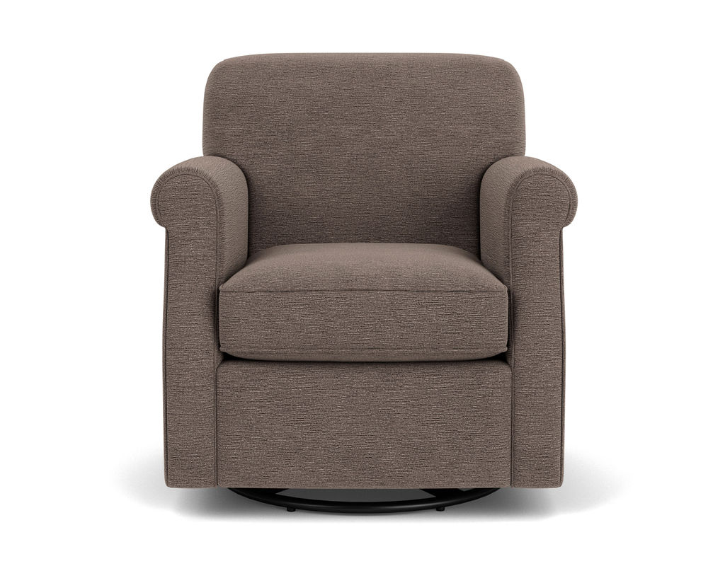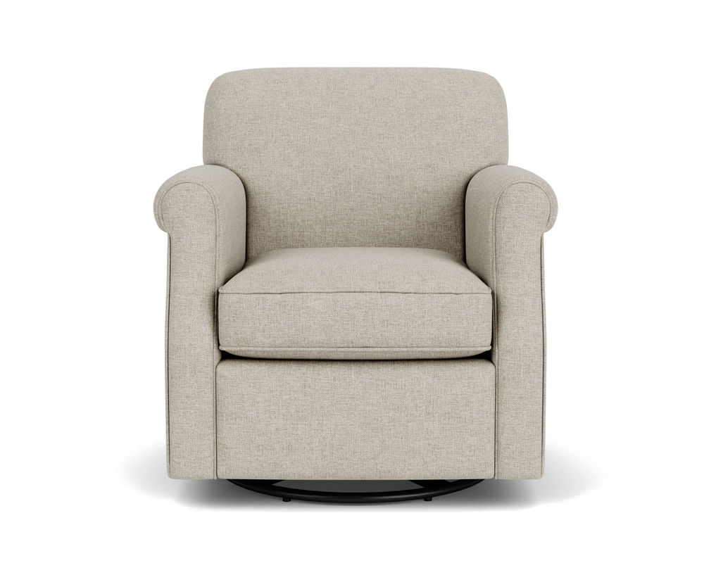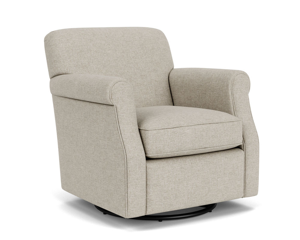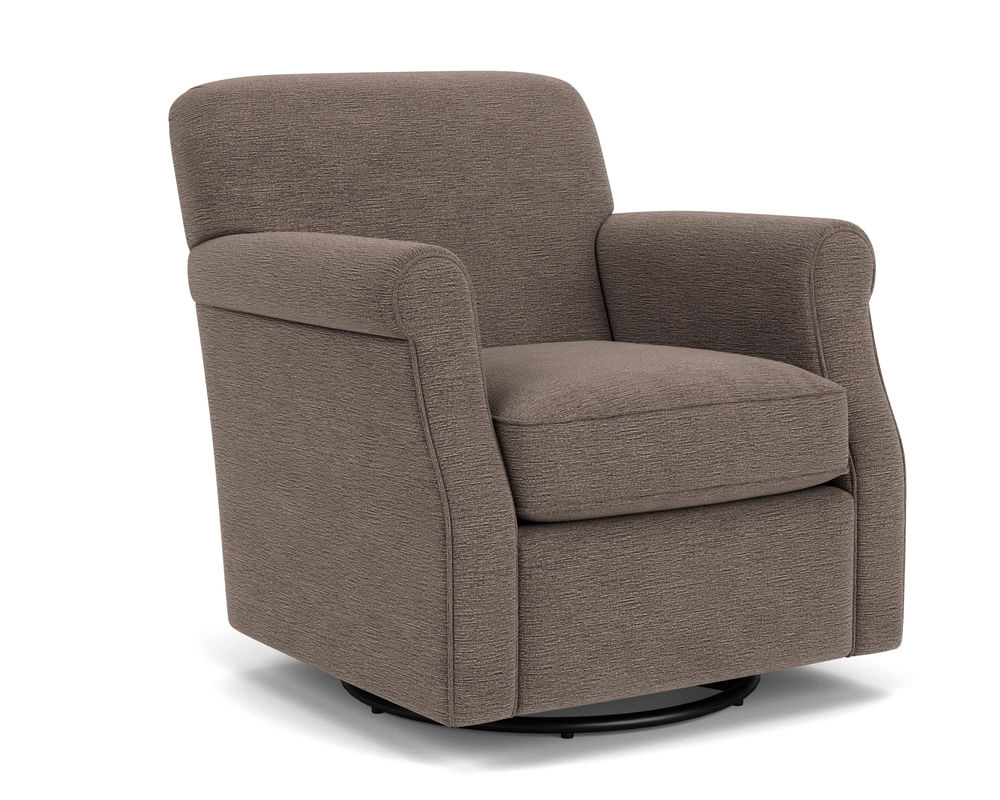 Experience ultimate comfort and style with the Mabel 0133 Swivel Chair. Its simple yet elegant design features a rounded tight back cushion and traditional rolled arms, giving it a timeless appeal. The welt cording detail on the arm fronts and seat cushion adds a touch of sophistication to its overall look.