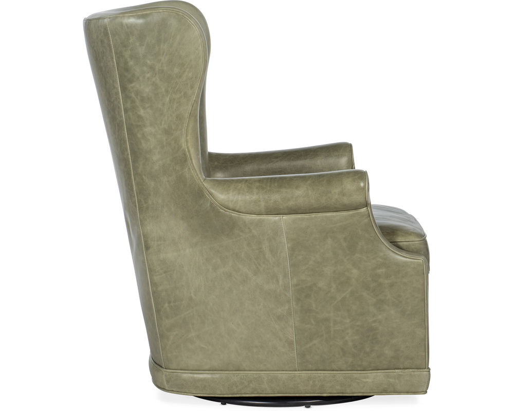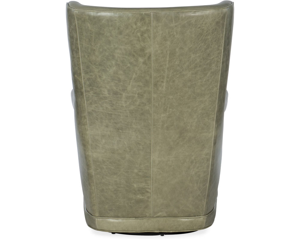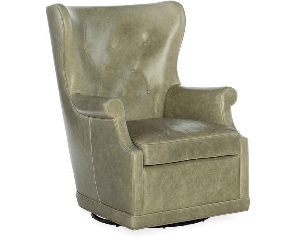 Gracefully Designed for Modern Comfort Reimagine tradition with the Mai Swivel Club Chair by Hooker Furniture. This contemporary take on the classic wing chair features a softly contoured silhouette, tight high back with refined button tufting, and a plush loose seat cushion wrapped in Bellaire Tranquil Sage — a luxurious aniline top grain leather. The chair’s tailored welt trim and smooth swivel base make it a versatile accent for modern, transitional, or eclectic interiors.