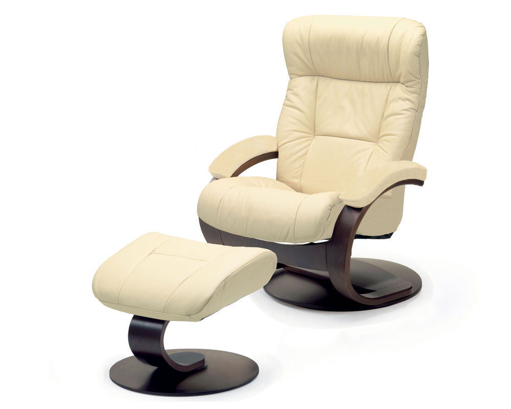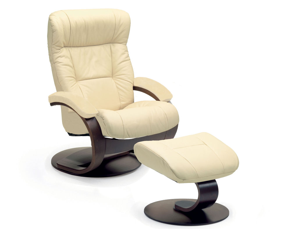 The Manjana C Swivel Recliner and Ottoman is an ergonomic recliner from Fjords that is a stylish addition to any living room. Crafted with top grain leather, this recliner has a swivel base with 360 degrees of rotation and offers continuous reclining of the back to provide comprehensive support that prevents tiredness in your legs and back. Your individual resting position is easily achieved by moving your body. Whether you are watching TV, reading a book, or surfing the net, prepare for relaxation on a whole new level once the Admiral R recliner and ottoman is sitting in your living room. The chair is available in two sizes, small and large. Select from over 30 top grain leathers and 7 base wood colors.