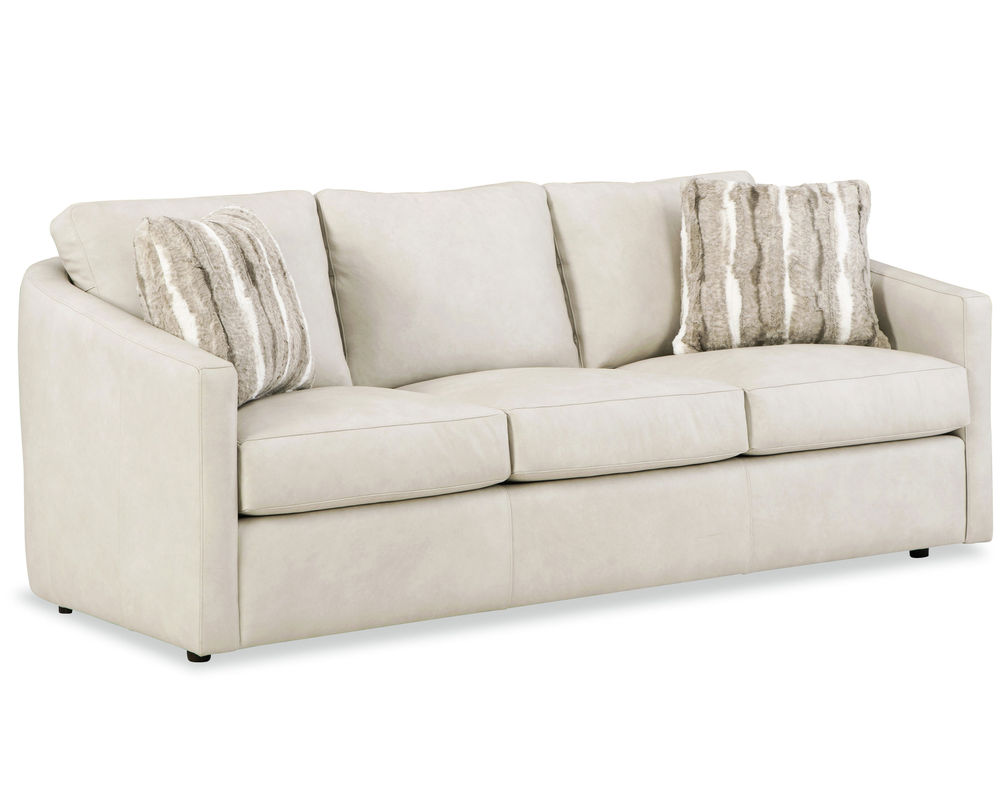 Introducing the Marlow 7168 Leather Sofa: the perfect addition to any home. This chic and curvy style from our CraftMaster Leather collection is sure to make a statement with its high-sloping track arm that wraps into a beautiful curve around the back. With its French seamed all over for a clean and modern aesthetic, this sofa also features attached box border back pillows and plush Blend Down Coil seat cushioning. As if that weren't enough, you can also get the matching loveseat, chair, swivel chair, and ottoman for a complete look. With the Marlow 7168 Leather Sofa, you can bring style and comfort to any room in your home.