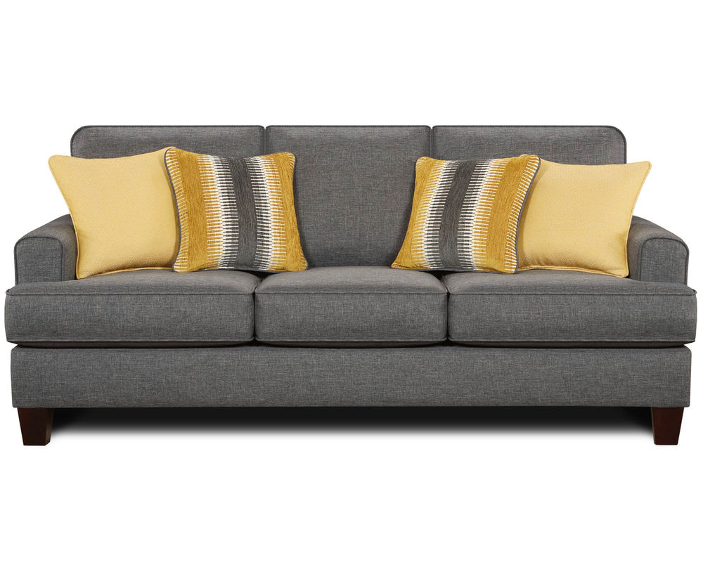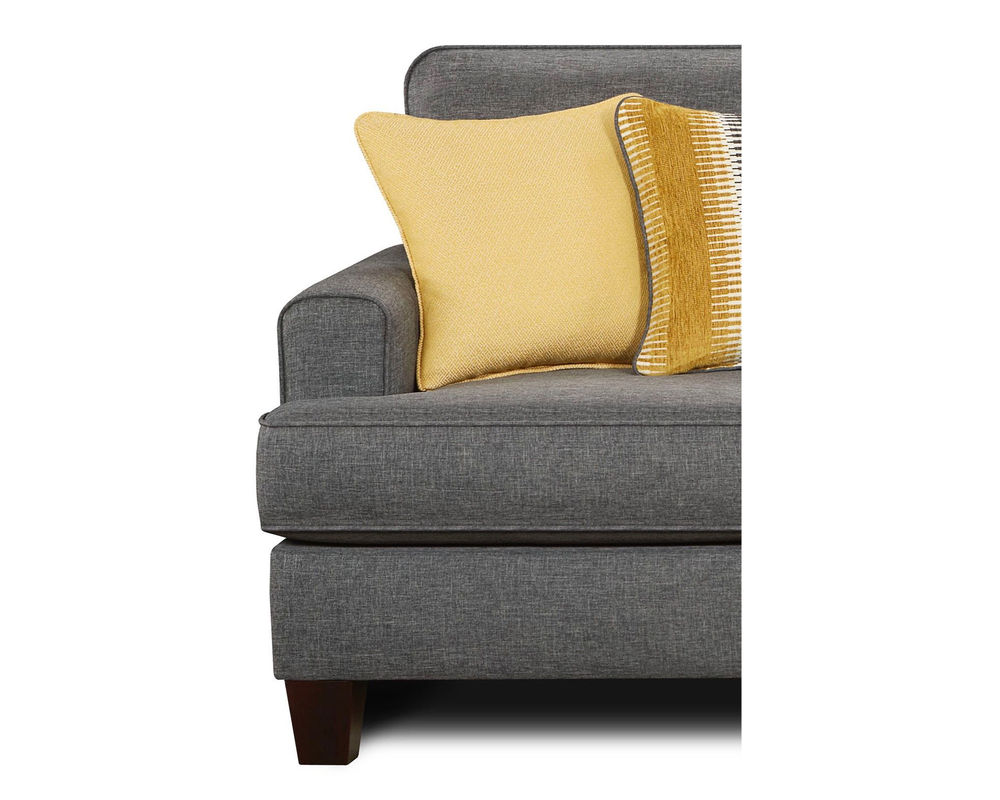 The Maxwell Gray Sofa is a beautiful, sophisticated transitional to traditional styled frame accented with 2 different contrasting accent pillows, rounded recessed arms, loose reversible box border t-cushions and inside back cushions. With them being reversible, you can rotate them to prolong the life of the fabric, as well as, the cushion cores. The coffee finish tapered wood legs only accent this best selling frame. The material is not only beautiful but also durable.
