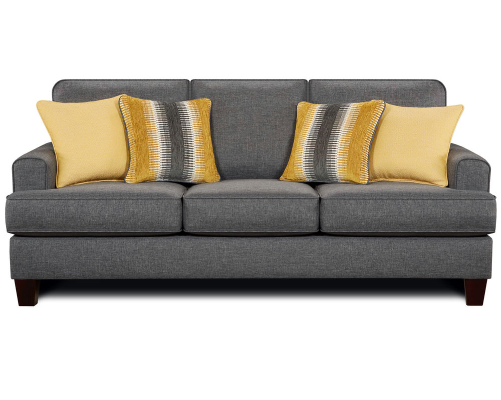 Crafted with utmost care, this sofa's pebble gray color has been carefully chosen to create a perfect balance with the eye-catching sunny yellow accents. The Moroccan quatrefoil and broad railroaded stripe design on the toss pillows add a subtle touch of pattern without overpowering the overall look. The corded welts not only enhance the sleek lines of the sofa but also neatly encase each area of the seating and back.