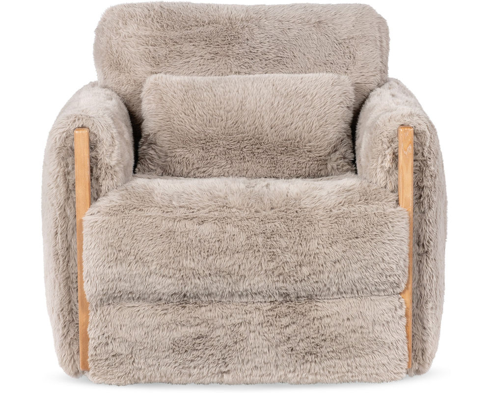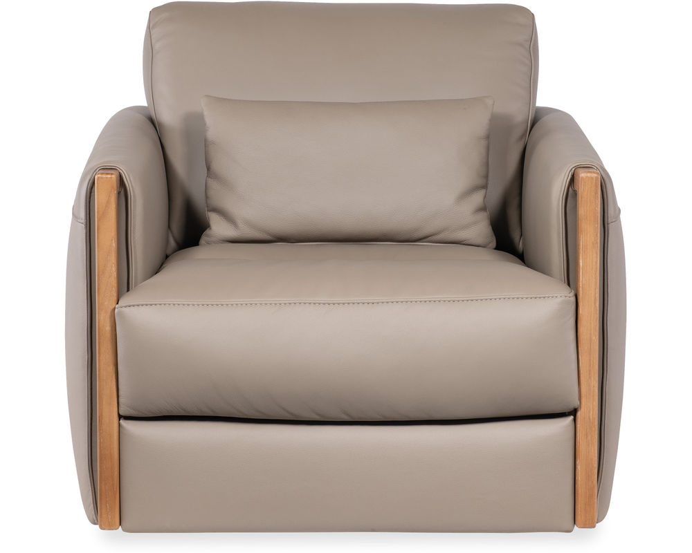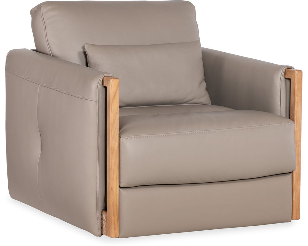 Introduce cozy sophistication to your living space with the Meridian Swivel Chair from Hooker Upholstery. Wrapped in the plush Yakity Yak Granite fabric, this chair brings inviting texture and warmth to modern interiors. The exposed wood trim along the arm fronts adds a tailored accent, while the included kidney pillow enhances comfort. Designed with a smooth swivel base, the Meridian is as functional as it is stylish—perfect for open-concept rooms or intimate conversation areas. Whether you’re relaxing or entertaining, this chair delivers elevated comfort and versatile charm.