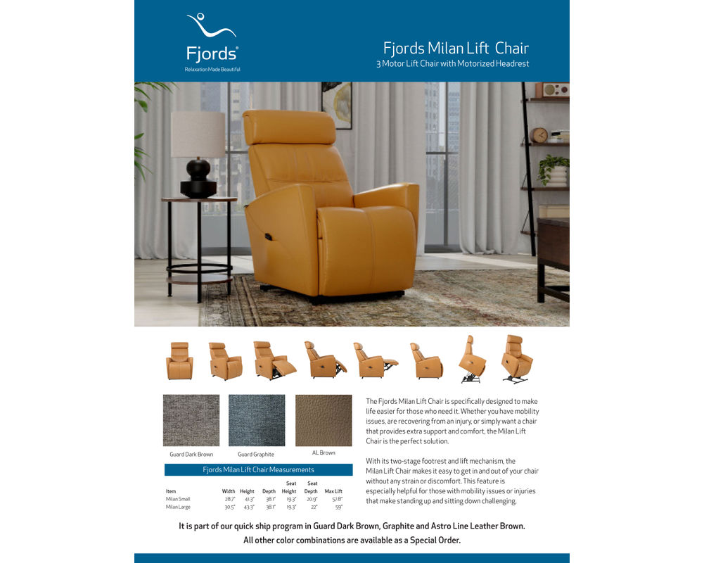 Designed by Fjords®, the Milan 3 Motor Lift Reclining Chair combines refined Scandinavian design with advanced engineering to deliver exceptional comfort, support, and ease of use. Its smooth three-motor system allows independent control of the backrest, footrest, and lift function, making it easy to find the perfect position for relaxing, reading, or resting. Thoughtfully contoured cushioning and an ergonomic seat promote proper posture and long-lasting comfort, while the adjustable headrest provides personalized neck and head support. Built with premium materials and heavy-duty construction, the Milan is designed for everyday reliability and supports up to 350 pounds. With its clean lines, modern silhouette, and quiet motorized performance, this chair offers a sophisticated solution for those who want both elegant design and dependable mobility assistance.
