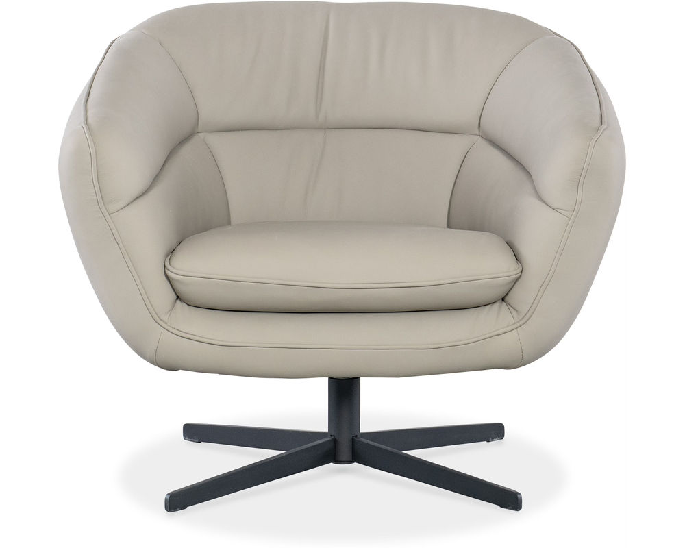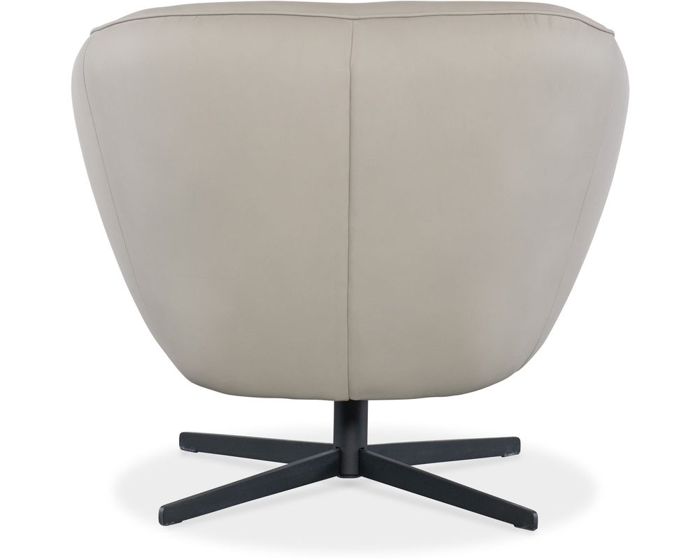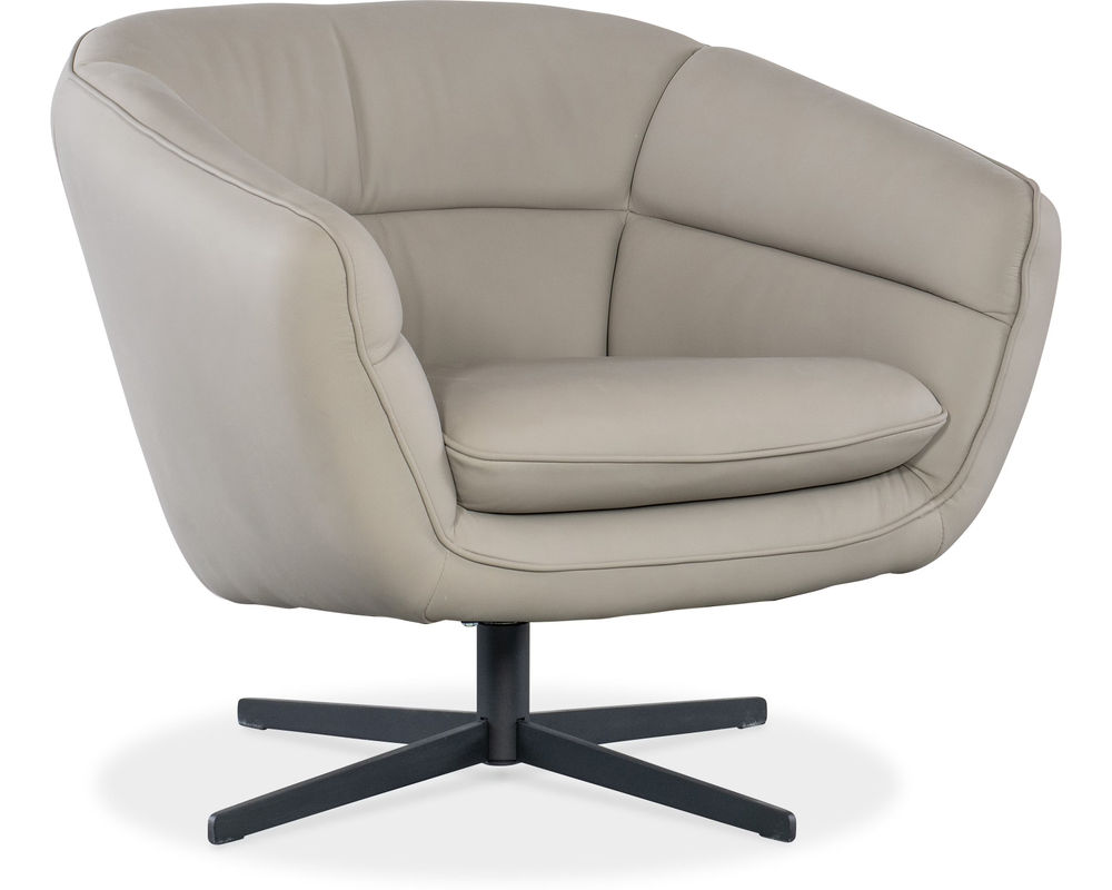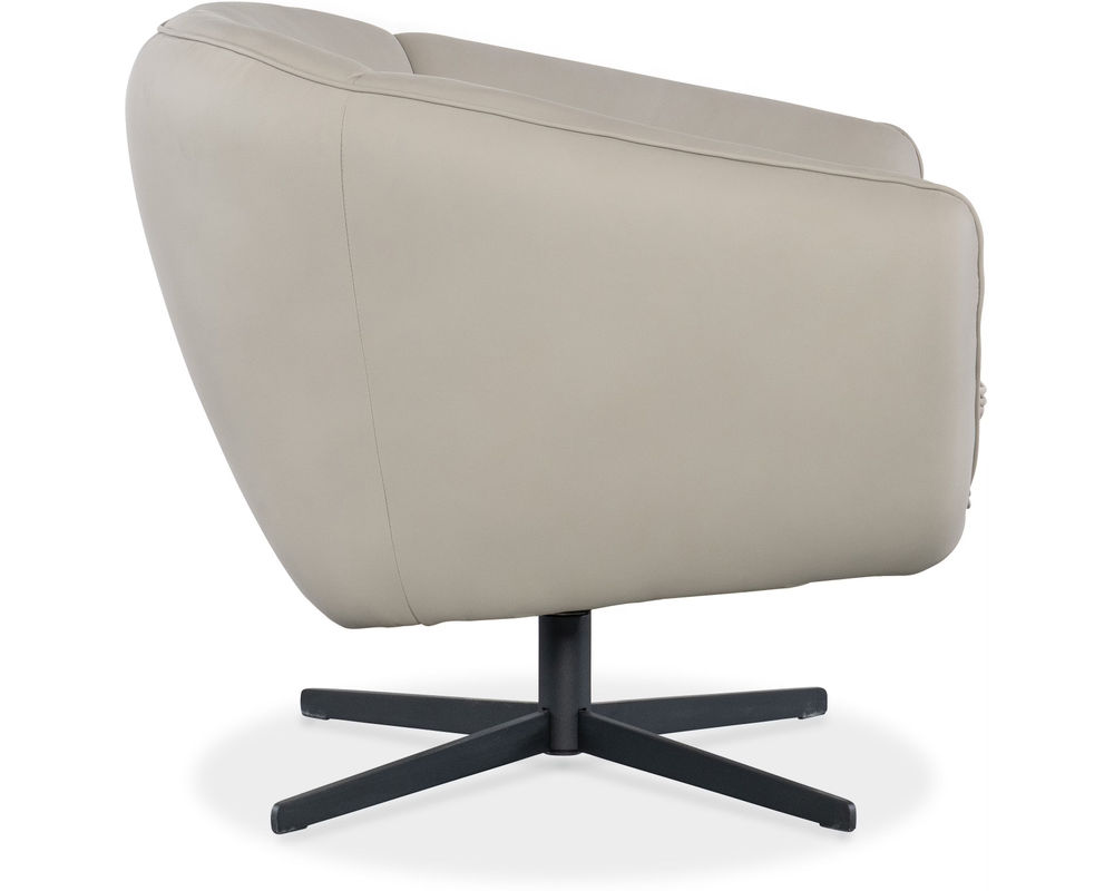 Mina Swivel Chair Add a bold statement to your modern living space with the Mina Swivel Chair from Hooker Furniture. Featuring a sleek barrel silhouette and wrapped in rich Buckskin Beige semi-aniline top grain leather, this chair exudes contemporary sophistication. The smooth 360-degree swivel motion and low-profile metal base offer both style and functionality, making it a perfect accent for upscale interiors.