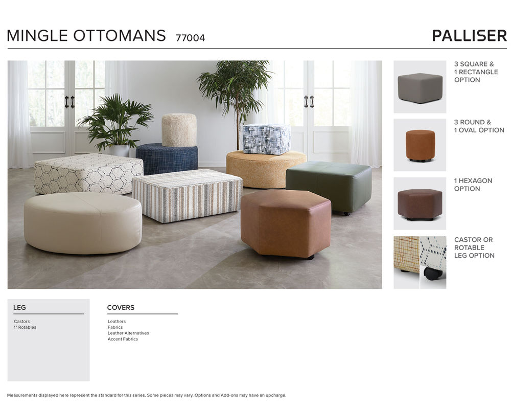 Take a break with the Mingle 23” x 23" square ottoman that features single top stitching for a clean and tailored finish. The Mingle Square Ottoman includes casters for easy movement and includes has over 200 fabrics and leathers to select from. All Palliser frames are constructed from engineered wood products, hardwood or softwood; joints are pinned and glued for uniformity and strength.