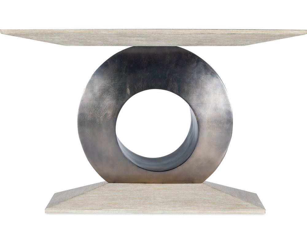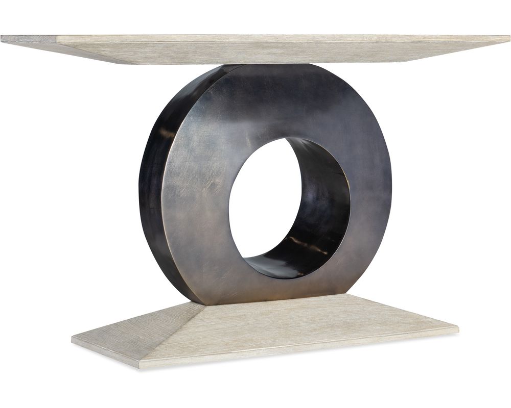 From Sofas and Sectionals.com: The Modern Mood Accent Console Table will introduce a touch of modern elegance to your home. This stunning piece features a bold and organic design that is sure to make a statement in any room. The table's sleek rectangular shape is perfectly complemented by its dramatic metal-wrapped circle base.