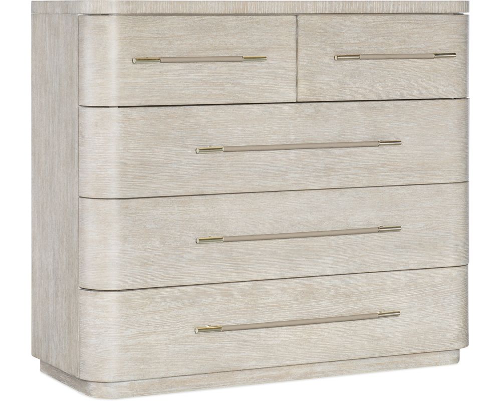 From Sofas and Sectionals.com: Introducing the Modern Mood Bachelor Chest—a beautifully designed statement piece that exudes sophistication and modern elegance. This chest features a clean and sleek profile, with rounded corners and a sturdy plinth base for added stability. It is expertly crafted with a luxurious mix of materials, combining Oak Veneers and metal accents for a stunning and unique look.