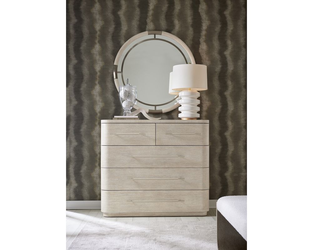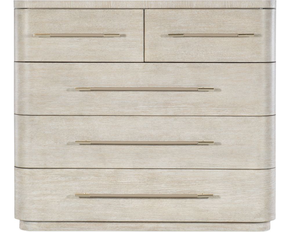 Finished in a serene Diamond color, this chest will effortlessly complement any modern or contemporary bedroom decor. The metal pulls on the drawers are wrapped in leather, adding a touch of elegance and sophistication. The combination of materials and the attention to detail in the design make this chest a truly unique and eye-catching piece.