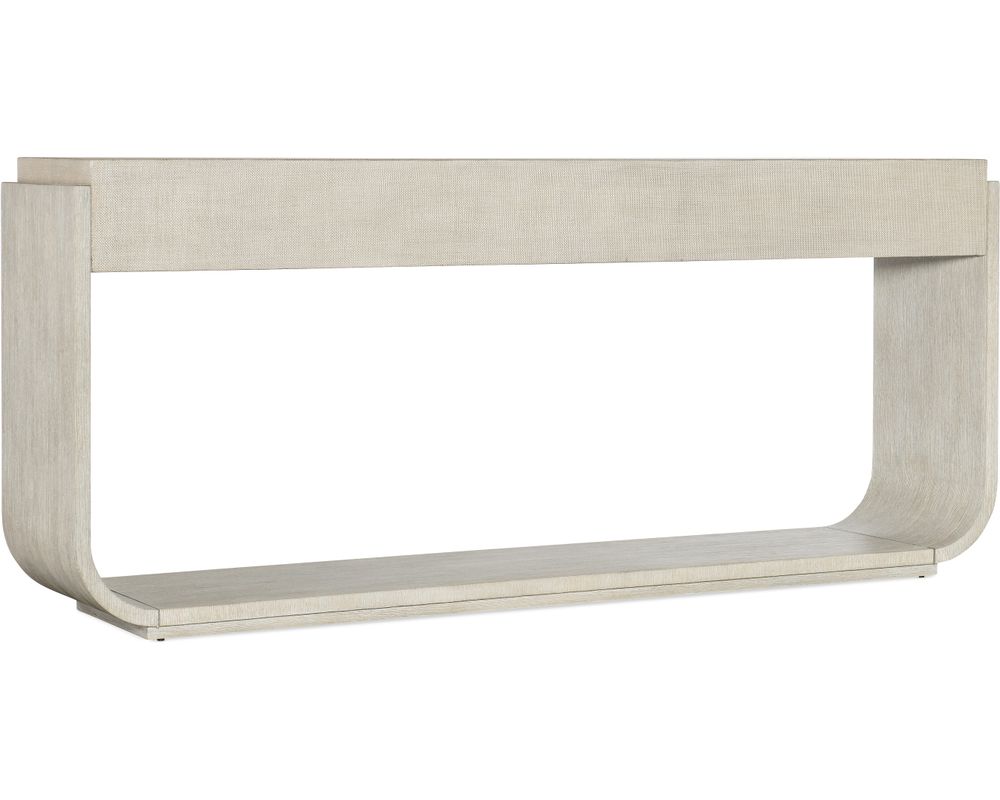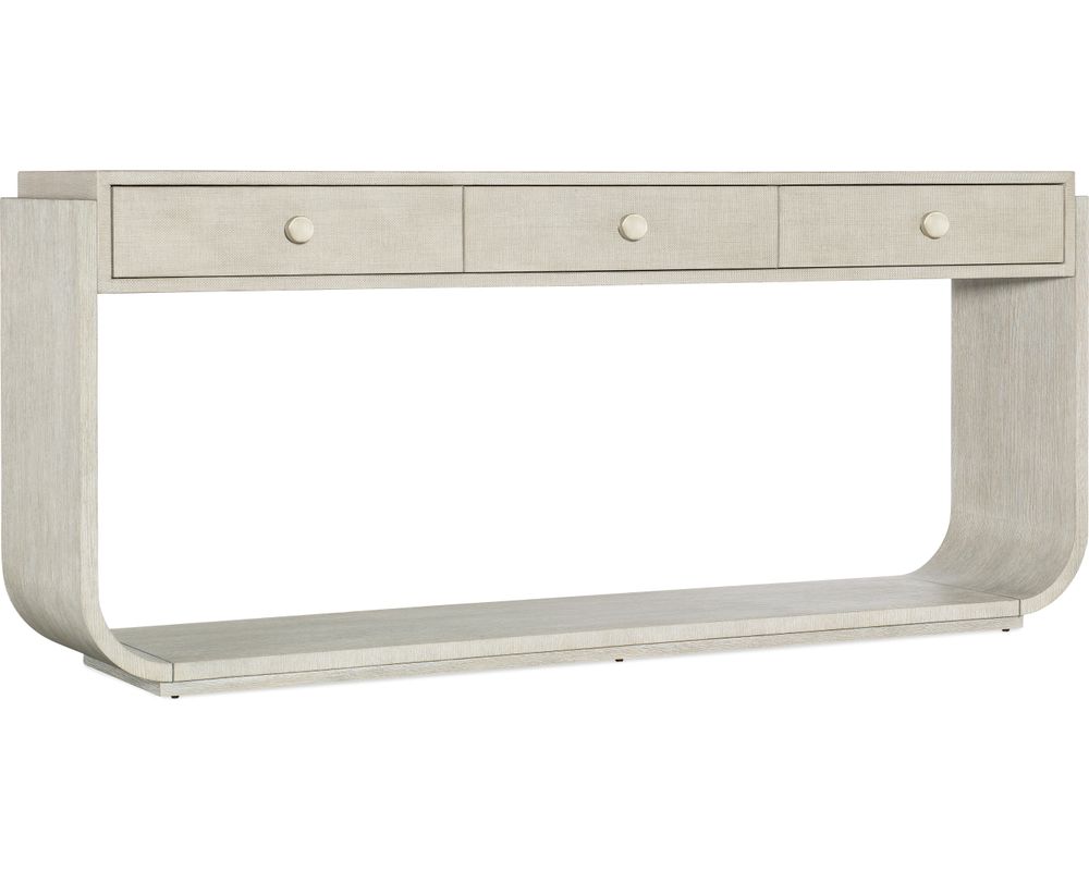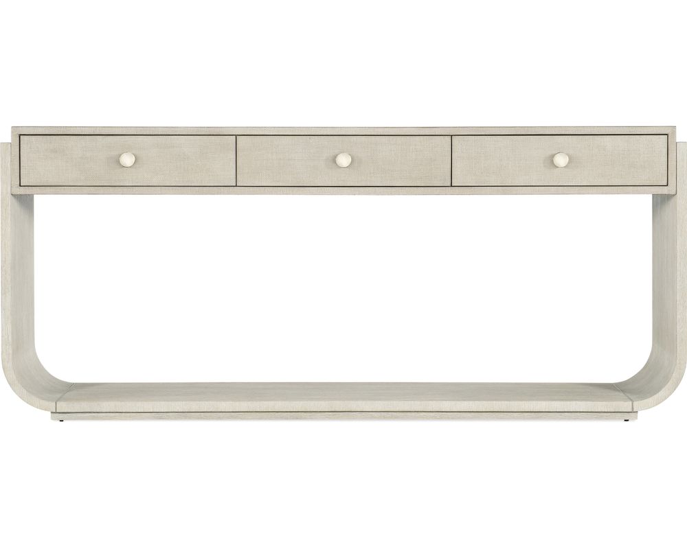 Crafted with a luxurious mixture of materials, the Modern Mood Console Table features a narrow rectangle shape with rounded sides, creating a sleek and sophisticated silhouette. The front and top of the drawer are wrapped in raffia, adding a touch of texture and visual interest.