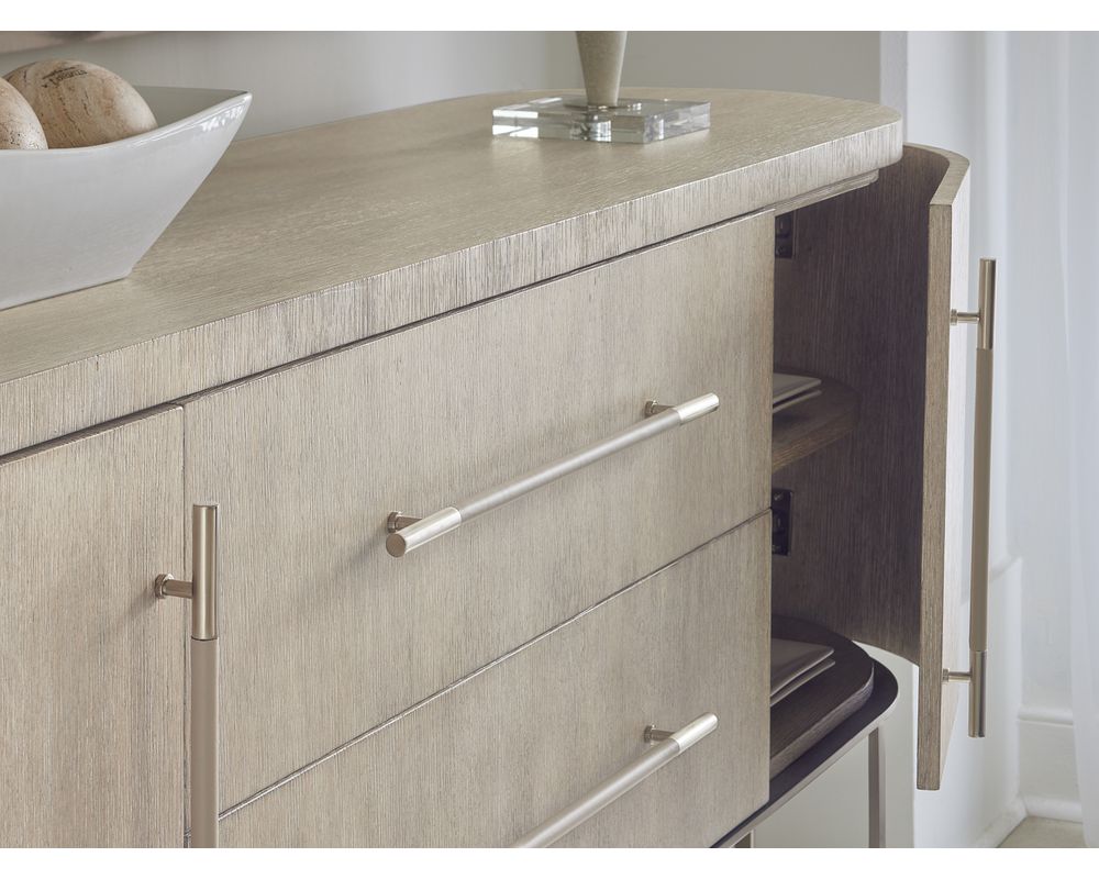 Unbound by geographical design, Modern Mood presents itself as an evolution of design choices, spanning various decades and design movements while maintaining an unmistakably modern aesthetic that transcends time. The 90-piece collection includes a bedroom, dining room, home office, accent, and occasional items characterized by substantive forms with soft architectural details. Elevated materials and brushed metal accents in a warm pewter finish are evident throughout the collection, including metal banding and edging and marble and glass accents. Crafted with flat-cut quartered oak veneer with wire-brushed detailing, Modern Mood is presented in two finishes: Mink and Diamond. Delivering a dark, earthy brown with notes of black, Mink provides a timeless aesthetic. With its crystal-like alabaster and pewter hues, the Diamond finish delivers a soft sophistication, evoking a sense of luxury and refinement.