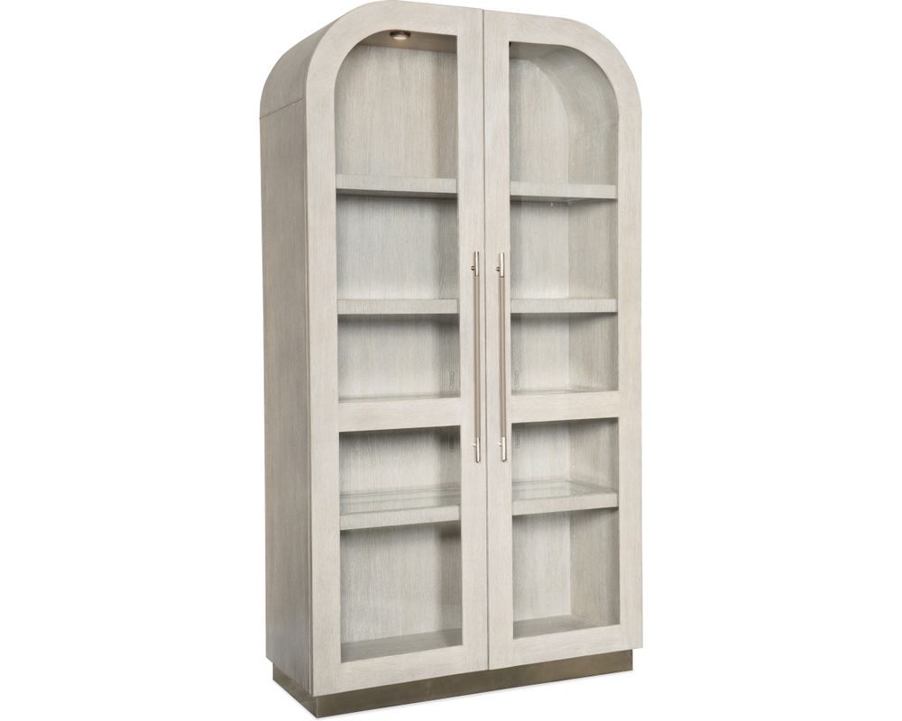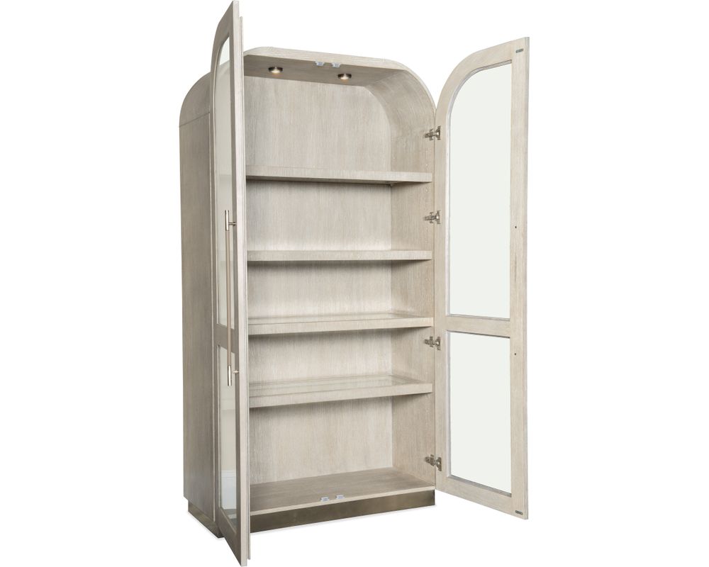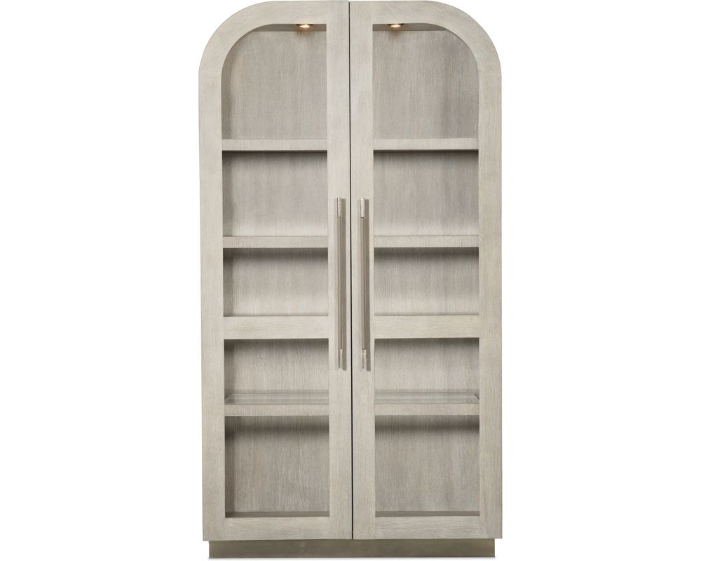 The Mood Display Cabinet's metal-wrapped base and metal bar pulls are finished in a warm pewter color, adding a touch of sophistication to its overall design. The bar pulls are further accented with leather, providing a luxurious touch to this stunning piece.