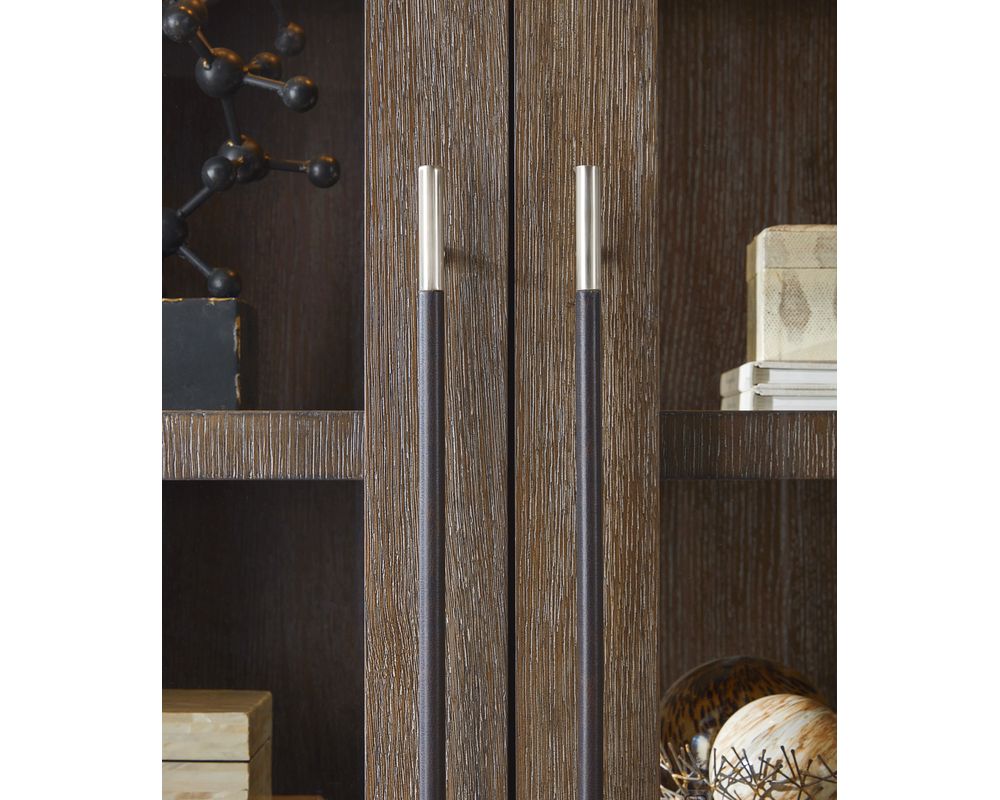 This cabinet boasts durability and functionality in addition to its elegant design. The metal-wrapped base and metal bar pulls, both in a warm pewter finish, add a touch of sophistication to the overall look. The bar pulls are also accented with leather, adding a subtle yet luxurious detail.