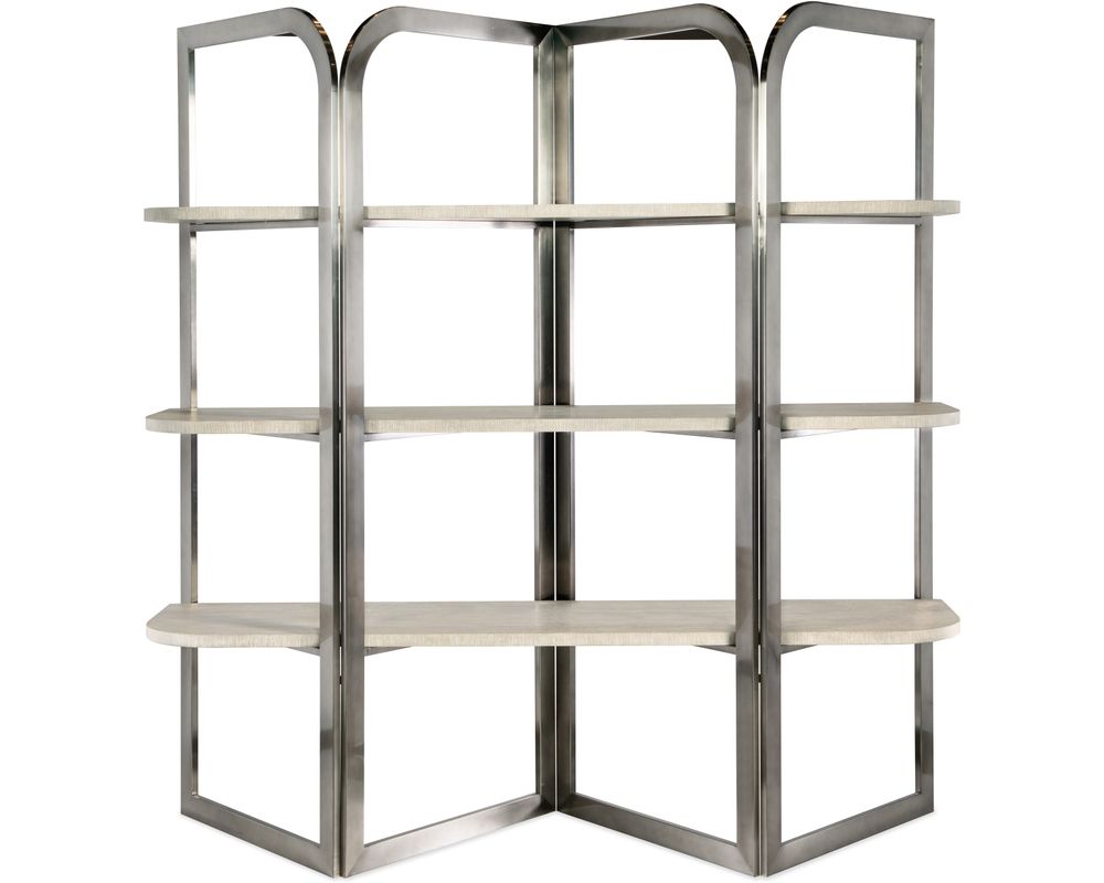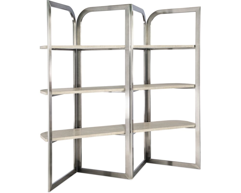 Surrounding the shelves is a shaped brushed metal frame in a warm pewter-colored finish. This adds a touch of contrast to the etagere and provides a sturdy and durable structure.