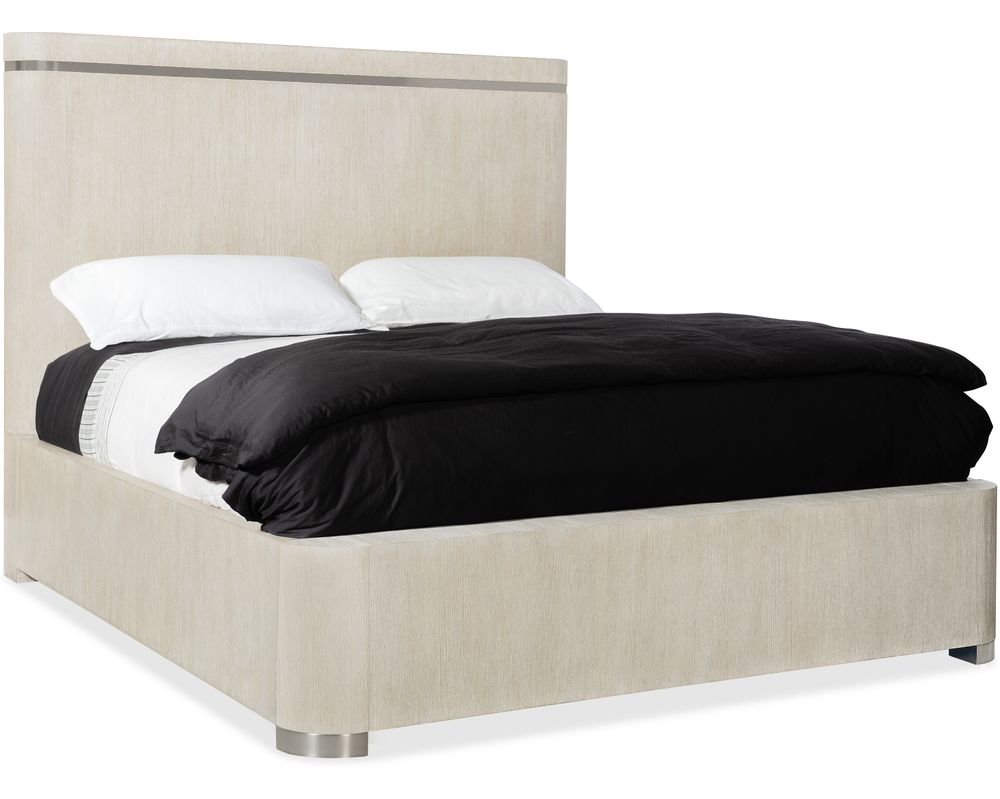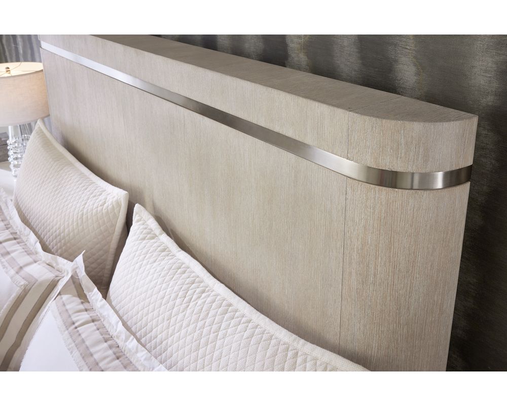 Crafted with attention to detail, the Modern Mood Bed features warm pewter-finished metal inlay trim on the headboard and metal-wrapped feet on the footboard. These elements add a touch of modern elegance and contrast the wire-brushed crystal-like Diamond finish on the Oak Veneer frame.