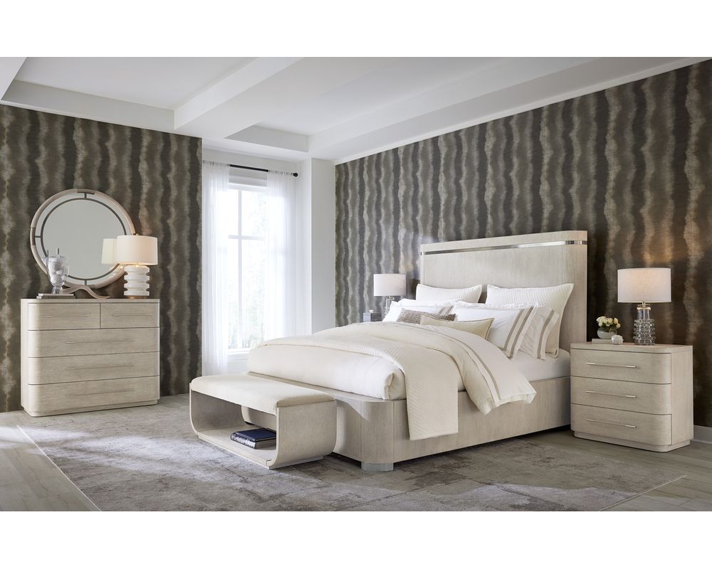 Unbound by geographical design, Modern Mood presents itself as an evolution of design choices, spanning various decades and design movements while maintaining an unmistakably modern aesthetic that transcends time. The 90-piece collection includes a bedroom, dining room, home office, accent, and occasional items characterized by substantive forms with soft architectural details. Elevated materials and brushed metal accents in a warm pewter finish are evident throughout the collection, including metal banding and edging and marble and glass accents. Crafted with flat-cut quartered oak veneer with wire-brushed detailing, Modern Mood is presented in two finishes: Mink and Diamond. Delivering a dark, earthy brown with notes of black, Mink provides a timeless aesthetic. With its crystal-like alabaster and pewter hues, the Diamond finish delivers a soft sophistication, evoking a sense of luxury and refinement.