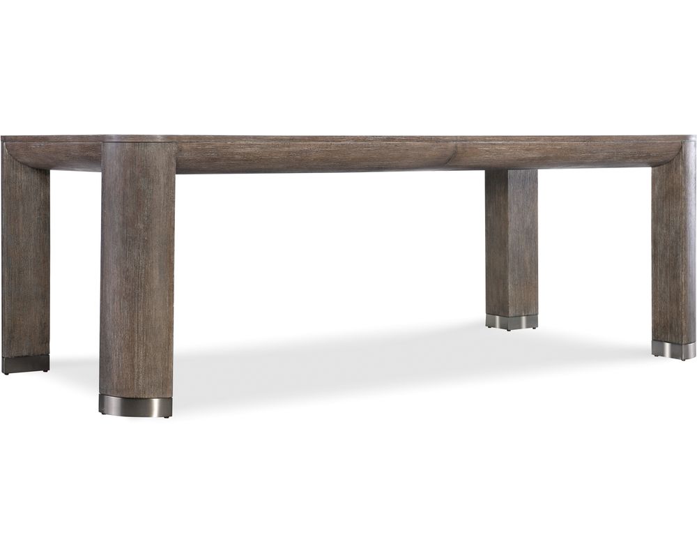 Crafted with high-quality materials, the Modern Mood Leg Dining Table is beautiful and durable. The table features a rounded apron and corners, adding a soft and elegant touch to its overall appearance. The top is made of quartered oak veneers, giving it a rich and earthy brown color with subtle hints of black. The metal banding accents on the legs are finished in a warm, pewter color, adding a touch of sophistication to the table.